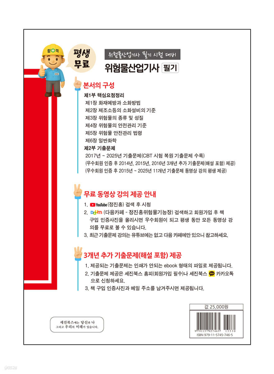 * 우수회원 인증 후 2014년, 2015년, 2015년 3개년 기출문제(해설 포함) 추가 제공 · 2017년 ~ 2025년(CBT 문제 포함) 9개년 기출문제 및 해설 수록 * 교재 질의 · 응답 카페 http://cafe.daum.net/dangerouspass(정진홍위험물세상) 1. 오랜 실무 경험과 학원 강의 경력을 기본으로 하여 집필하였다. 2. 모든 과목에 대한 핵심 요약정리를 통하여 학습시간을 단축할 수 있게 하였다. 3. 최근 과년도 문제를 총 정리하여 초보자 입장에서 상세한 해설을 하였다. 4. 한국 산업인력공단의 출제기준을 토대로 최근 출제경향을 완전 분석할 수 있습니다. 5. 저자 직강 동영상을 카페로 제공하여 책과 시청각 교육을 함께 할 수 있도록 하였다. |