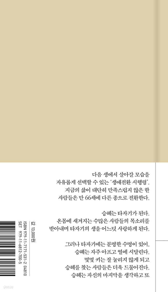 --- p.9 나는 무엇이 되고 싶은 걸까. 사랑하는 사람들끼리는 나중에 어디서 무엇이 되어 다시 만나자는 약속도 한다는데, 승혜에게는 이번 생을 지나 다음 생에서까지 다른 모습으로 만나고 싶은 사람도, 그런 부질없고 낭만적인 약속을 할 감정도 남아 있지 않았다. --- p.25 그리고 마침내 두 번째 생애전환기가 되었을 때, 승혜는 망설임 없이 한번 거부당한 맥반석이 아닌 자갈을 선택했다. 그냥 아무 수식어 없는 자질구레한 돌. 바위도 반석도 아니고 너무 뜨겁지도 너무 차갑지도 않은 상온 상태의 잔돌. 그것만큼 자신의 무욕을 증명할 것도 없다고 생각했다. 그런데 만 66세 생애전환기 검사를 하고 일주일 후, 막상 승혜가 부여받은 새로운 생은 타자기였다. --- pp.42-43 타자기의 생을 승혜는 사랑하게 되었다. 어쩌면 이대로 영영 살아봐도 좋을 것 같았다. 그러나 그건 승혜의 의지만으로 가능한 것이 아니었다. 타자기에는 분명한 수명이 있었다. 잦은 비명과 드문 탄성을 반복해서 겪는 동안 승혜는 자주 열이 올랐고 자주 한기에 시달렸다. 타자기의 생에도 갱년기의 시간이 도래한 모양이었다. --- p.57 자신의 몸이 둔해졌다는 것을, 두드려도 제대로 눌리지 않는다는 것을 승혜도 알고 있었다. ‘보고 싶어’라고 치면 ‘보고 싶어’라고 눌리는 대신 ‘보고 싶ㅓ’가 된다는 걸, ‘기다릴게’라는 글자를 누르면 ‘기ㅏ릴게’가 된다는 걸 승혜도 알고 있었다. --- p.58 어쩌면 나이가 든다고 현명해지거나 안정되는 게 아니고, 그러지 않을 수도 있고 그렇다고 그게 실패나 틀린 게 아니며, 여전히 헤매도 되고 더 잘 헤매는 방식으로 살아가도 된다는 걸 조금은 알게 되었기 때문인지도 모르겠다. 그런데, 정말 그런가? 아니다. 실은 불안한 것이다. 그래서 열심히 늙음도 괜찮다고 나를 달래며 어떻게 늙어갈 것인가를 생각해보는 거겠지. 보편 노인의 불안을 안고 소멸의 방식을 열심히 농담의 형태로 고민해보면서. --- p.97 「작가의 말」 중에서 |