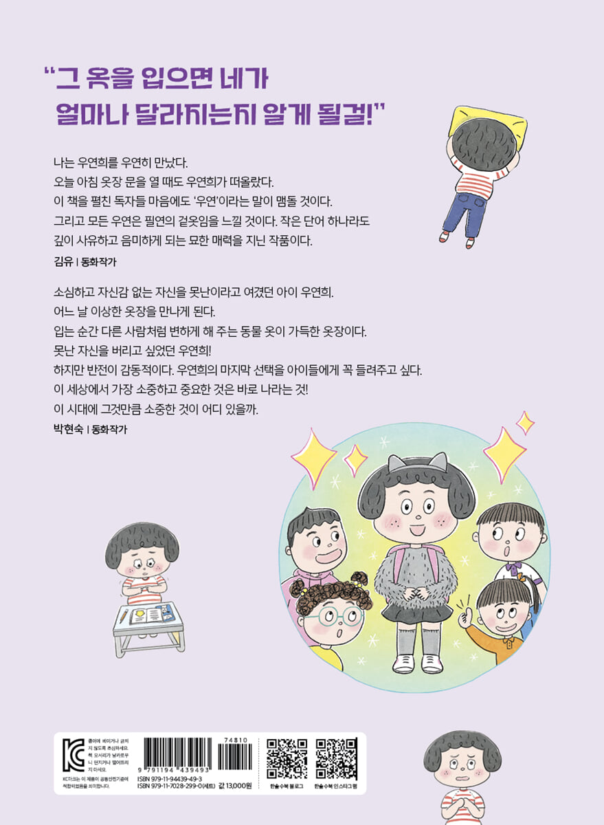 나는 우연희를 우연히 만났다. 오늘 아침, 옷장 문을 열 때도 우연희가 떠올랐다. 이 책을 펼친 독자들 마음에도 ‘우연’이라는 말이 맴돌 것이다. 그리고 모든 우연은 필연의 겉옷임을 느낄 것이다. 작은 단어 하나라도 깊이 사유하고 음미하게 되는 매력을 지닌 작품이다. - 김유 (동화작가)