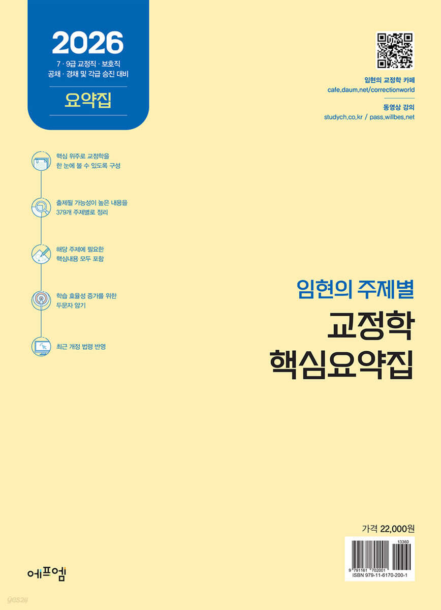 CHAPTER 01 교정학 서론 001 교정의 개념 및 범위 16 002 교정의 이념 16 003 행형(行刑)과 교정(矯正) 17 004 교정학의 특징 17 005 교정학의 전개과정 17 006 교정의 역사적 발전과정 18 007 우리나라 교정시설 명칭의 변천 18 008 고대 및 삼국시대의 형벌제도 19 009 고려시대의 형벌제도 20 010 조선시대의 형벌제도 20 011 1894년 갑오개혁 22 012 일제시대의 형벌제도 22 013 미군정시대의 형벌제도 23 014 선시제도(Good Time System) 23 015 교정시설의 발전 24 016 교정시설의 건축구조 25 017 우리나라의 교정조직 및 교정시설 26 018 존 하워드(John Howard)의 감옥개량운동 26 019 구금제도 27 020 수형자 선거권 제한 위헌/헌법불합치 결정(공직선거법 제18조 제1항 제2호 위헌확인) 29 021 수용자의 권리주체성 29 022 서덜랜드와 크레세이(Sutherland & Cressey)의 수형자 부문화의 유형 31 023 슈랙(Schrag)의 수형자 역할유형 31 024 교도소화(prisonization) 32 025 과밀수용(過密收容) 32 026 집합적 무능력화와 선별적 무능력화 34 027 범죄인 처우모델 34 028 범죄인 처우의 기본원칙 36 029 비범죄화(Decriminalization)와 비형벌화(Depenalization) 37 030 다이버전(Diversion, 전환) 38 031 수형자 자치제도(Inmate Self-Government System) 39 032 회복적 사법 40 CHAPTER 02 시설 내 처우 033 형집행법의 목적 42 034 수용자와 수형자 42 035 형집행법의 적용범위 42 036 차별금지 43 037 교정시설의 규모 43 038 교정시설 설치 · 운영의 민간위탁 43 039 순회점검 44 040 시찰과 참관 44 041 교도관의 직무 44 042 범죄횟수 46 043 수용의 요건 47 044 신입자 수용 시의 조치 47 045 간이입소절차 48 046 신입자 거실과 석방예정자 거실 49 047 수용자의 거실지정 시 고려사항과 작업부과 시 고려사항 49 048 신입자 및 다른 교정시설로부터 이송되어 온 사람에 대한 고지사항 49 049 수용의 거절 50 050 형집행법상 구분수용의 원칙 50 051 구분수용의 예외 51 052 분리수용 51 053 독거수용의 원칙 및 독거수용의 구분 52 054 독거수용의 예외(혼거수용) 52 055 수용자의 이송 53 056 수용자의 가족에게 알려야 할 사항 53 057 수형자 등 호송 규정 53 058 국제수형자이송법 55 059 수용자에 대한 음식물의 지급 56 060 물품의 자비구매 57 061 휴대금품의 보관 58 062 보관할 수 없는 휴대품 58 063 전달금품 59 064 음식물의 전달 및 음식물 외의 물품의 전달 59 065 유류금품의 처리 60 066 교정시설의 청결 60 067 실외운동 61 068 건강검진 횟수 62 069 감염병에 관한 조치 62 070 부상자 등 치료 63 071 외부 의료시설 진료 63 072 수용자의 의사에 반하는 의료조치 64 073 접견제한, 청취 · 기록 · 녹음 · 녹화 및 접견중지 사유 64 074 접견 횟수 65 075 접견 장소 66 076 소송사건의 대리인인 변호사 및 「형사소송법」에 따른 상소권회복 또는 재심 청구 사건의 대리인이 되려는 변호사와의 접견67 077 접견 방법 67 078 편지수수의 원칙 68 079 편지수수의 제한 사유 68 080 금지물품의 확인을 위하여 편지를 봉함하지 않은 상태로 제출하게 할 수 있는 경우 68 081 편지 검열사유 69 082 편지의 발신 · 수신 금지사유 69 083 전화통화 불허가 사유 70 084 전화통화 내용의 청취 또는 녹음 70 085 전화통화 중지사유(접견중지 사유와 같음) 70 086 전화통화의 허용 횟수 71 087 현행법상 종교활동의 내용 및 제한 71 088 신문 등의 구독 72 089 라디오 청취와 텔레비전 시청 72 090 집필 73 091 형집행법상 특별한 보호의 대상 74 092 여성수용자에 대한 기본적인 처우 74 093 여성수용자에 대한 처우와 여성교도관 75 094 임산부인 수용자의 처우 75 095 유아의 양육 76 096 노인수용자의 처우 76 097 장애인수용자의 처우 78 098 외국인수용자의 처우 79 099 소년수용자의 처우 80 100 누진제도의 유형 81 101 수형자 수용 · 처우의 원칙 및 처우의 개시 82 102 개별처우계획의 수립 · 변경 82 103 경비등급별 교정시설 83 104 현행법령상 중간처우 84 105 전담교정시설 수용대상 84 106 분류심사의 원칙, 제외대상 및 유예 85 107 분류심사 사항 85 108 분류심사의 종류 86 109 정기재심사 86 110 부정기재심사사유 86 111 분류전담시설 87 112 분류처우위원회 87 113 주요 위원회의 설치, 구성인원, 위원장 88 114 처우등급의 구분 88 115 기본수용급의 분류 89 116 경비처우급 89 117 경비처우급에 따른 작업부과기준 89 118 개별처우급의 분류 90 119 소득점수 90 120 처우등급별 수용 및 물품지급 91 121 처우등급별 처우 91 122 봉사원 선정 92 123 자치생활 92 124 가족 만남의 날 및 가족 만남의 집 93 125 경기 또는 오락회 개최 93 126 형집행법 시행규칙 제92조의 사회적 처우 94 127 작업 · 교육 등의 지도보조 94 128 개인작업 95 129 외부 직업훈련 95 130 현행법상 교육의 실시 96 131 교육 취소, 일시중지 96 132 교육대상자의 이송 및 작업 97 133 현행법상 교육과정 97 134 교화프로그램의 종류 98 135 형집행법상 작업의 부과 98 136 작업의 종류 및 특징 99 137 작업의 종류의 결정, 고지 및 작업실적의 확인 100 138 교육 · 교화프로그램과 작업의 의무 및 신청에 따른 구분 및 신청 작업의 취소 100 139 작업시간, 휴일의 작업 및 작업의 면제 101 140 작업수입, 작업장려금, 위로금 · 조위금 101 141 외부통근작업대상자 및 개방지역작업 대상자의 선정요건 102 142 집중근로에 따른 처우 102 143 교도작업의 운영 및 특별회