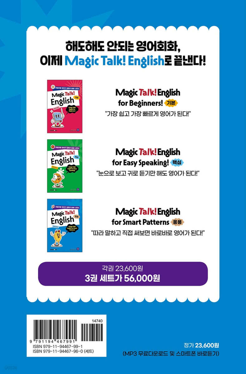 1 Magic Talk! English 3권으로 영어회화하는데 가장 중요한 패턴들을 집중적으로 수록하였다. 2 시작하기에 앞서 영어회화에서 자주 쓰이는 부사나 부사구를 총정리하여 영어회화하는데 도움이 되도록 하였다. 3 Section 3의 재미난 영어세계 이모저모에서는 〈알쏭달쏭 영단어구분하기〉, 〈바로잡자! 콩글리시!〉, 그리고 〈사연있는 영어표현들〉을 수록하여 부담없이 영어에 접근할 수 있는 공간을 만들었다. 4 또한 Supplement에서는 〈놀라운 감탄사의 세계〉(1권), 〈시공을 초월하여 교훈을 주는 영어속담 Best 28〉(2권), 그리고 〈세월이 가도 잊혀지지 않는 명언과 미신!〉(3권)을 수록하여 영어학습에 다양성과 풍요로움을 더했다. 5 모든 영문은 생기발랄한 네이티브들의 목소리로 들을 수 있다. 〈구성〉 1 단계별로 〈Magic Talk! - 기본〉, 〈Magic Talk! - 핵심〉, 그리고 〈Magic Talk! - 응용〉 등 총 3권으로 구성되어 있다. 2 3권 모두, Section 1, 2, 3, 그리고 Supplement로 다양하게 꾸며져 있다. 3 각권에서 Section 2에 녹음된 네이티브를 따라 집중적으로 반복해서 큰소리로 말해보고, 직접 필사까지 해보면 영어실력이 일취월장할 것이다. 4 Section 1, 3은 Seciton 2를 학습하기 위해 워밍업을 하고 Section 2 학습을 끝내고 영어의 다양한 모습을 부담없이 보여주기 위해 수록되었다. 5 Supplement를 통해 영어에 대한 추가적인 정보들을 수록하여 한권한권 마무리를 할 수 있도록 꾸며져 있다. |