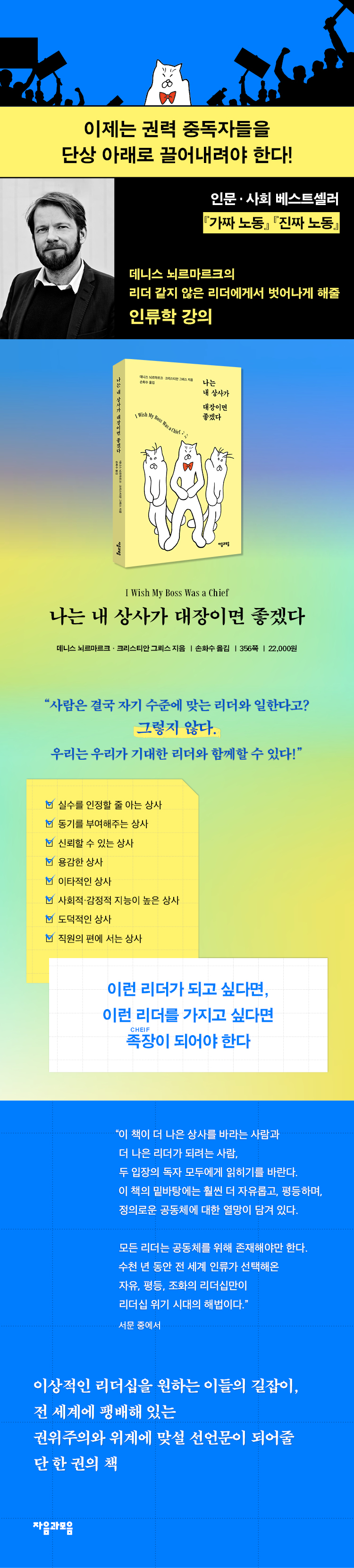 한국 사회에서 일어나는 가짜 노동에 대한 논의는 동아시아 또한 구시대적인 노동과 리더십에 대한 이상에 의문을 제기하고, 느리고 억압적이며 획일적인 리더십에서 벗어나고자 하는 열망이 커지고 있음을 보여줍니다. 『나는 내 상사가 대장이면 좋겠다』가 그 흐름을 더욱 가속화하는 데 작게나마 보탬이 되기를 바랍니다. 아울러 이 책이 한국의 역동적이고 중요한 민주주의 발전에 기여하기 바라고, 정치와 경제는 물론 앞으로 사회가 어떤 리더십을 이상적인 본보기로 추구할 것인가에 대한 논의에도 영감을 줄 수 있기를 진심으로 기대합니다.