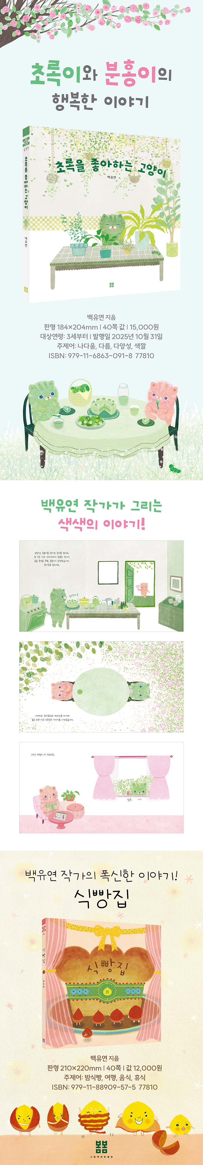 초록이는 초록빛이 가득한 세상에 살고 있습니다. 마찬가지로 분홍이도 분홍만이 가득한 세상에 살고 있지요. 둘은 우연히 서로를 알게 되었습니다. 초록이는 분홍이에게 초록을 전하고, 분홍이는 초록이에게 분홍을 전하지요. 초록으로 가득했던 초록이의 집에 조금의 분홍이 생기게 됩니다. 마찬가지로 분홍이의 집에도 초록이 조금 생기게 되지요. 둘은 서로의 다름을 부정하지 않고 자연스럽게 받아들입니다. 새로운 것을 유연하게 받아들입니다. 그러던 어느 날, 분홍이에게 먼저 변화가 생깁니다. 분홍빛 털을 가진 분홍이의 머리에 초록색 털이 난 것이지요. 깜짝 놀란 분홍이는 걱정하며 초록이를 찾아갑니다. 초록이는 새싹 같다며 분홍이를 위로하지요. 그리고 며칠 후, 초록빛 털을 가진 초록이에게도 분홍색 털이 납니다. 서로 다른 둘이 자신들의 세상에 타인을 받아들이자 생긴 일이었습니다. 하지만 싫지 않았습니다. 그러고 보니, 세상엔 여러 다양한 색의 고양이들이 있었습니다. 앞으로 어떤 색을 만나게 될지 기대하게 되었지요. |