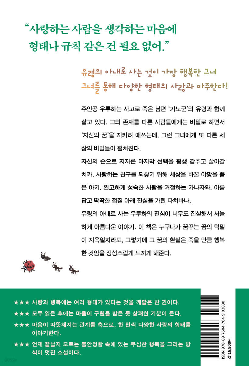 주눅든 삶에 용기를 북돋는 아름다운 서사 “자신의 꿈은 자신만이 지킬 수 있다. 세상 모두가 부정할지도 모르고, 아무도 믿어주지 않을 수도 있다. 그러니 각오가 필요하다. 우리가 보는 꿈의 종이 한 장 아래는 지옥이지만, 그렇기에 죽을 만큼 행복한 것이다.” 유령의 아내로 사는 주인공 우루하의 진심이 너무도 진실해서 서늘하게 아름다운 이야기. 이 책은 누구나가 꿈꾸는 꿈의 턱밑이 지옥일지라도, 그렇기에 그 꿈의 현실은 죽을 만큼 행복한 것임을 정성스럽게 느끼게 해준다. 결혼한 지 2년째에 교통사고로 죽은 남편의 장례식. 유령 남편은 자신이 죽은 줄도 모르고 여전히 아내 곁에 존재한다. 잠시 혼란스럽던 주인공은 자신의 비현실적인 ‘현실’을 받아들이고 유령의 아내로 살고자 결심하는데, 알고 보니 그런 그녀의 주변 역시 모두가 나름의 비현실적 ‘현실’ 속에 살아가고 있었다. 설사 그 비현실성이 ‘유령’은 아니더라도 누구나 저마다의 ‘비밀’을 갖고 있었던 것. 그렇듯 “세상은 비밀로 가득하지만, 그래도 아무런 불편 없이 돌아감”을 깨닫는 주인공을 통해 ‘진실한 꿈은 신이 지켜주심’을 느끼게 하는 것이 이 소설의 미덕이 아닐까 싶다. 그러니까 이 소설은 어쩌면 주눅든 우리들 삶에 용기를 북돋는 이야기일 수 있겠다. 모든 꿈이 혼자서 꿀 수밖에 없는 것이지만, 우리들 각자가 스스로 그 꿈을 아름답게 여긴다면 그 꿈은 실현 여부와 상관없이 결코 헛된 것이 아님을 말이다. |