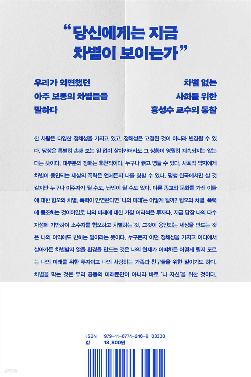 역차별의 상징이 되어버린 여성가족부가 폐지된다고 남성들이 행복해질까? 실제로 여성가족부 예산의 대부분은 가족 · 청소년 분야에 쓰이며 여성 분야 예산은 17퍼센트뿐이다. 이 예산은 성희롱 · 성폭력 · 성매매 예방 및 피해자 보호, 아동 · 청소년 성 보호, 경력 단절 여성 지원 등에 배정되어 있다. 이것을 남성에게도 공평하게 분배하면 평등한 사회가 될 수 있을까? --- 「프롤로그」 중에서 아이를 거부할 수 있다면 다른 사유로도 누군가를 거부할 수 있다. 노키즈존이 영업의 자유라면 흑인 출입 금지, 무슬림 출입 금지, 동성애자 출입 금지, 이런 것들도 다 용인될 수 있는가? 아니나 다를까, 노키즈존의 확대는 어떤 어른들의 출입을 금지하는 노아재존, 노아줌마존, 노시니어존으로까지 이어졌다. 이렇게 어떤 집단에 속하는 사람들을 편의적으로 영업의 자유라는 이유로 배제할 수 있는 사회를 과연 공동체 구성원 모두가 자유롭고 평등한 사회라고 할 수 있는지 묻고 싶다. --- 「1장 차별에 대해서 나누고 싶은 이야기」 중에서 차별의 피해자들은 차별을 당했을 때 인격적 모멸감이나 수치심 또는 모욕·비하·멸시당하는 느낌이 들었다고 말한다. (...) 더 나아가 이런 일이 앞으로 또 일어날 수도 있다는 불안감과 공포감을 느낀다. 세상의 모든 곳에서 자신을 환영하지 않을지도 모른다는 불안과 공포에 휩싸이게 되는 것이다. --- 「2장 차별은 왜 나쁜가」 중에서 자유의 가치는 소중하지만 ‘차별해도 되는 자유’가 만드는 세상은 끔찍하다. 이것은 특정한 음식점에 들어갈 수 없다거나 어떤 회사에 취업할 수 없다는 것 정도의 문제가 아니다. 케이크는 다른 제과점에서 구입해도 되고 취업할 데가 그곳만 있는 것도 아니지 않겠는가. 하지만 이렇게 차별이 아무렇지 않은 일이 된 사회의 모습을 상상해보자. 만약 ‘케이크 가게 주인의 자유’가 허용된다면 동성애자는 일상의 모든 영역에서 ‘동성애자에게도 허용되는지’ 확인해야 한다. --- 「6장 차별금지 영역」 중에서 차별금지법은 종교의 자유를 제한하는 것이 아니라 회사에서 트랜스젠더라는 이유로 해고할 자유, 대학에서 동성애자 학생을 차별할 자유, 사회복지시설에서 성소수자를 괴롭힐 자유를 금지하는 것이다. 이러한 자유를 종교의 자유라는 이유로 보장할 수는 없다. --- 「10장 종교와 차별」 중에서 어떤 정책을 추진하기 위해 기본이 되는 사항, 예컨대 기본 용어의 정의, 정책 추진 원칙과 방향, 추진 체계, 재원 조달 방법 등을 종합적으로 규정하는 입법을 ‘기본법’이라고 하는데, 차별금지법도 중구난방 흩어져 있는 차별금지 관련 법령들의 ‘우산’ 역할을 하는, 차별에 관한 기본법이다. 차별금지법 앞에 ‘포괄적’이라는 말을 붙여 포괄적 차별금지법이라고 부르기도 하는데, 여기서 포괄적이라는 것은 차별금지 사유와 영역을 포괄적으로 규정한다는 뜻이다. --- 「12장 차별을 막는 가장 큰 우산 ‘차별금지법’」 중에서 명시적인 차별이 사라졌다고 해서 차별이 없는 게 아니다. 구조적인 차별이 드러날수록 이를 해결하기 위한 적극적인 법·제도적 조치들에 관심을 갖게 되지만 구조적 차별의 현실을 부정하면 정확히 그 반대다. 각자도생하며 개인적으로 해결하면 되니 국가가 관심을 가져야 할 이유가 없어진다. --- 「16장 구조적 차별을 부정한다면?」 중에서 한 사람은 다양한 정체성을 가지고 있고, 정체성은 고정된 것이 아니라 변경될 수 있다. 당장은 특별히 손해 보는 일 없이 살아가더라도 그 상황이 영원히 계속되지는 않는다는 뜻이다. 대부분의 장애는 후천적이다. 누구나 늙고 병들 수 있다. 사회적 약자에게 차별이 용인되는 세상의 폭력은 언제든지 나를 향할 수 있다. 평생 한국에서만 살 것 같지만 누구나 이주자가 될 수도, 난민이 될 수도 있다. 다른 종교와 문화를 가진 이들에 대한 혐오와 차별, 폭력이 만연한다면 ‘나의 미래’는 어떻게 될까? 누구든지 어떤 정체성을 가지고 어디에서 살아가든 차별받지 않을 환경을 만드는 것은 나의 현재가 어떠하든 어떻게 될지 모르는 나의 미래를 위한 투자이고 나의 사랑하는 가족과 친구들을 위한 일이기도 하다. 차별을 막는 것은 우리 공동의 미래뿐만이 아니라 바로 ‘나 자신’을 위한 것이다. --- 「에필로그」 중에서 |
