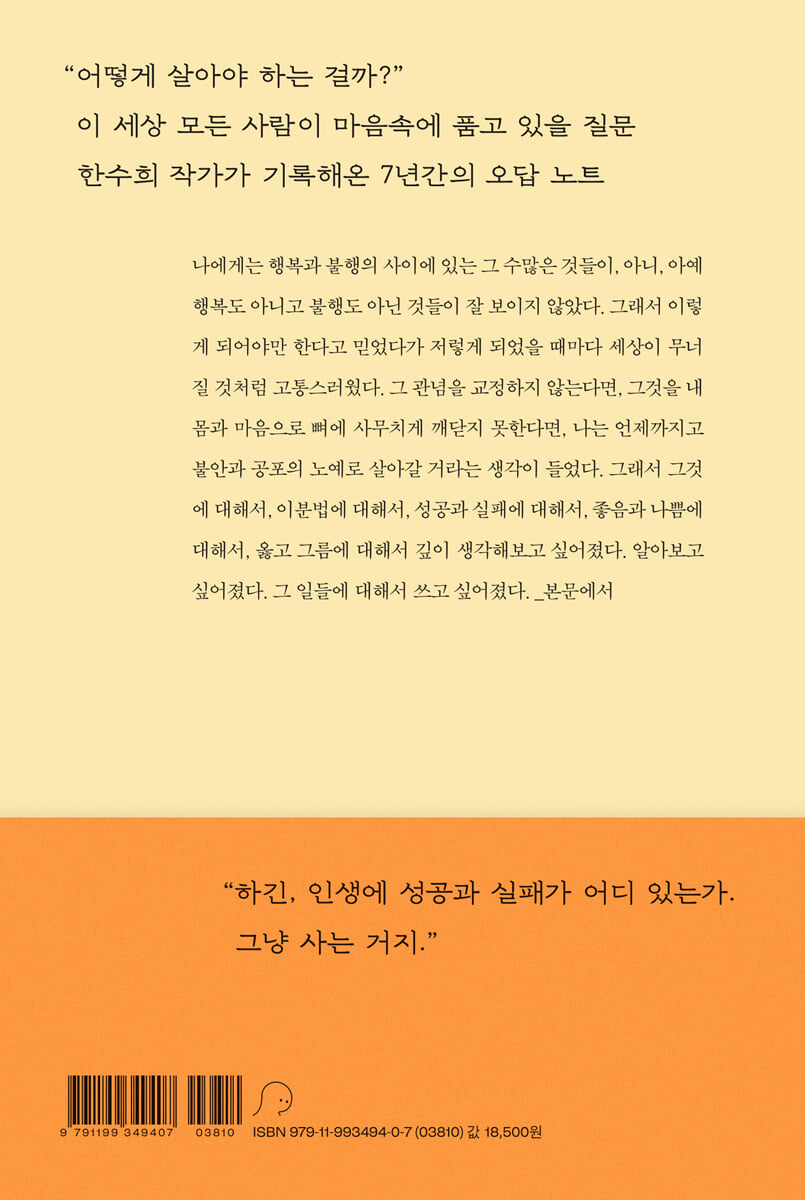 나에게는 행복과 불행의 사이에 있는 그 수많은 것들이, 아니, 아예 행복도 아니고 불행도 아닌 것들이 잘 보이지 않았다. 그래서 이렇게 되어야만 한다고 믿었다가 저렇게 되었을 때마다 세상이 무너질 것처럼 고통스러웠다. 그 관념을 교정하지 않는다면, 그것을 내 몸과 마음으로 뼈에 사무치게 깨닫지 못한다면, 나는 언제까지고 불안과 공포의 노예로 살아갈 거라는 생각이 들었다. 그래서 그것에 대해서, 이분법에 대해서, 성공과 실패에 대해서, 좋음과 나쁨에 대해서, 옳고 그름에 대해서 깊이 생각해보고 싶어졌다. 알아보고 싶어졌다. 그 일들에 대해서 쓰고 싶어졌다.