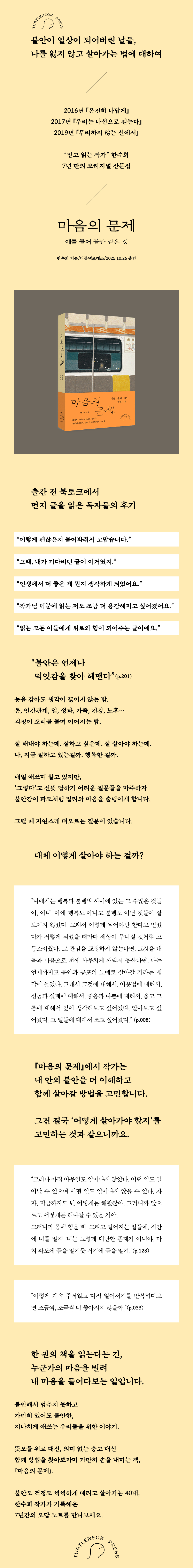 이 세상 모든 사람이 마음속에 품고 있을 질문. 한수희 작가가 기록해온 7년간의 오답 노트 『마음의 문제』는 한수희 작가가 불안장애를 진단받으며 시작된다. 무엇이든 잘해내야 한다는, 걱정마저 잘해야 한다는 압박감에, 모든 일에 대비하고 통제하기 위해 애를 쓰며 살아온 40여 년의 시간이 마음의 문제를 일으킨 것이다. 게다가 누군가에게 의존하고 폐를 끼쳐서는 안 된다는, 스스로가 세운 벽은 불안이 삶을 뒤흔드는 가속 페달이 되었다. 처음으로 마음의 문제를 마주한 작가는 다시 묻기 시작한다. 좋은 삶이란 무엇인가, 어떻게 살아야 할 것인가. “불안 없는 인생이 가능할까.” 불안에 대한 이야기는 곧 살아가는 이야기 미래를 걱정하고, 관계에 흔들리고, 스스로를 강박적으로 점검하며 살아가는 지금의 우리는 모두 불안하다. 입 밖으로 말하지 않아도 늘 곁을 따라다니는 감정, 불안. 『마음의 문제』가 말하는 ‘불안’은 병명이 아니라 ‘삶’의 또다른 이름이다. 그래서 이 책은 불안을 품고 그럼에도 나를 잃지 않고 살아가기 위해 끊임없이 질문하는 작가의 생각을 따라가며 나만의 답을 찾는 여정이기도 하다. 누군가의 경험 속에서 나를 다시 발견하고 표현할 언어를 찾는 일 우리가 에세이를 읽는 또 하나의 이유. 머릿속을 맴도는 생각, 지금의 감정을 표현할 언어를 찾고 싶어서. 한수희 작가의 글은 우리가 스스로를 더 들여다보고, 질문하고, 결국 그걸 표현하고 싶게 하는 힘이 있다. 한 걸음 내디뎌 살아갈 수 있도록, 조용한 용기를 내도록 이끈다. 『마음의 문제』는 불안을 이야기하지만, 결국 나를 이해하고 지금의 나로 살아갈 힘을 건넨다. 한수희 작가가 건네는 12편의 이야기, 12곡의 음악 『마음의 문제』에는 12편의 산문이 묶여 있다. 긴 호흡으로 쓰여진 글 한 편을 읽고 나면 한수희 작가가 직접 고른 음악을 QR코드를 통해 들을 수 있다. 음악을 추천한 이유도 함께 써놓았다. 음악은 글의 여운을 이어주기도, 글에서 느낀 감정을 더 확장해주기도 한다. 읽는 일과 듣는 일이 포개지며 『마음의 문제』를 더 다층적으로 경험할 수 있을 것이다. |