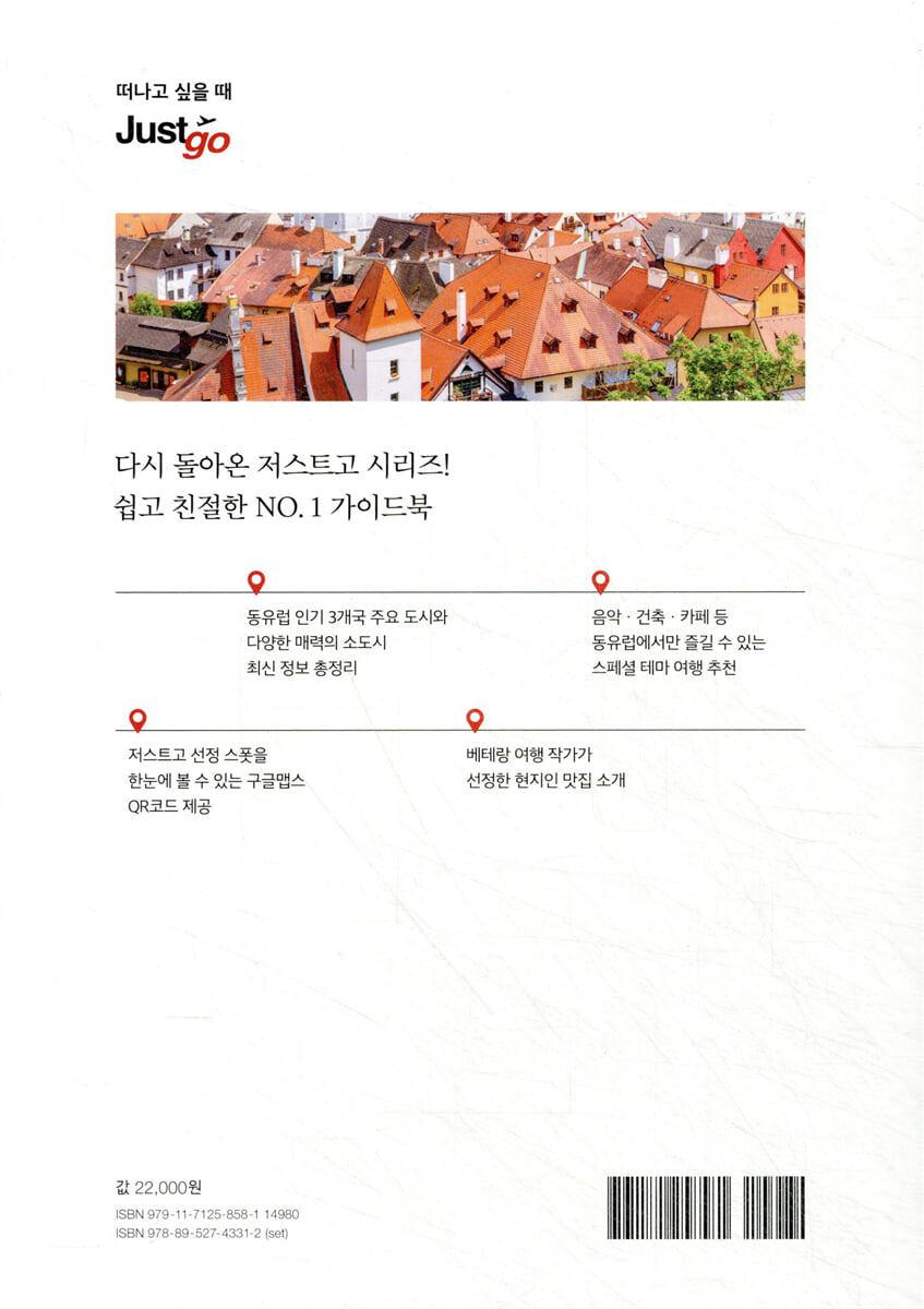 화려한 음악과 왕가의 역사, 아름다운 자연으로 사랑받는 동유럽. 『저스트고 동유럽 3개국』은 인기 3개국 체코, 오스트리아, 헝가리의 최신 여행 정보와 노하우를 담았다. 효율적인 여행 동선을 짤 수 있는 다양한 맞춤 일정은 물론, 주요 관광 명소와 교통편, 구글 지도 QR코드도 제공한다. 개성 있는 선물용 기념품을 구할 수 있는 쇼핑 스폿, 고단한 여행 뒤 편안하게 휴식할 숙소 등 다양한 정보를 알차게 담았다. 베테랑 여행 작가가 직접 맛보고 소개하는 맛집 정보와 카페도 여행의 즐거움을 더한다. 특별한 나만의 여행을 즐기고 싶다면 예술·미식·힐링으로 구성한 '스페셜 테마 여행'도 꼭 살펴보자. 최근 뜨고 있는 동유럽 소도시도 놓치지 말자. 한 번의 여행으로도 '나만의 동유럽'을 만날 수 있는, 당신에게 꼭 필요한 가이드북이다. ● 초보 여행자에게 딱 맞는 최적의 여행 코스 추천 동유럽 여행이 처음이라면 아마도 가장 걱정되는 건 '일정과 동선'일 것이다. 그런 고민을 해결하기 위해 세심하게 짠 여행 코스를 보기 쉽게 정리했다. 2개국~3개국을 도는 일정부터, 코스별 소요 일정과 이동 시간, 3개국 주요 도시 간 이동 방법도 교통편 별로 정리했다. 여행을 떠나기 전 책에서 소개하는 관광 명소와 식당, 쇼핑 스폿을 조합해 일정을 짜 보자. 저스트고에서 제공하는 구글 지도 QR코드를 적극 사용하길 추천한다. 여행의 고민을 단박에 해결하면서, 원하는 여행을 손쉽게 만들 수 있을 것이다. ● 이곳은 꼭 가야해! 동유럽 대도시 A부터 Z까지 합스부르크 왕가의 중심지였던 동유럽답게 발길 닿는 곳마다 역사가 살아 숨 쉰다. 시간이 멈춘 듯 중세의 아름다움을 간직한 체코 프라하, 음악과 예술의 중심지이자 왕가의 유적이 어우러진 오스트리아 빈, 황금빛 야경으로 빛나는 도나우강의 진주 헝가리 부다페스트. ‘아는 만큼 보이는’ 여행의 묘미를 살리기 위해 명소별 어우러진 역사를 친절하게 풀었다. 여행지에 숨어 있는 이야기를 따라가다 보면, 어느새 동유럽을 둘러싼 문화와 예술을 알차게 누릴 것이다. ● 이색적인 매력이 한가득! 동유럽 소도시 A부터 Z까지 관광객이 가득한 주요 도시들을 지나왔다면 고즈넉한 매력의 소도시로 가 보는 건 어떨까? 18세기 왕족과 유명 인사들의 휴양지였던 온천 도시 카를로비바리, 그림 같은 호수 마을 할슈타트, 모차르트의 고향이자 음악의 도시 잘츠부르크 등. 우리가 잘 몰랐던 소도시만의 이채로운 매력을 상세히 소개한다. 소도시는 동유럽 3개국 전역에 흩어져 있지만 책 속의 안내를 잘 따라간다면 충만한 여행을 경험할 수 있다. ● 나만의 ‘취향’을 따라 만드는 스페셜 테마 여행 여행을 특별하게 만들어 줄 테마 여행을 소개한다. 관광지만 구경하는 게 아니라 나만의 취향으로 즐기고 싶다면 작가가 엄선한 테마 여행을 살펴보자. 클림트와 실레 등 세기말 예술을 즐길 수 있는 미술 여행, 나라별로 맛과 향기가 다른 동유럽 와인과 맥주 여행, 모차르트와 베토벤 같은 거장의 발자취를 따라 걸으며 음악 축제를 즐기는 음악 여행, 합스부르크 왕가의 흔적을 찾아보는 역사 여행, 온천과 자연 속에서 피로를 푸는 힐링 여행까지 알차게 준비했다. ● 베테랑 작가가 엄선한 동유럽 카페 소개 여행의 묘미라면 역시 맛집과 카페 탐방! 유구한 역사를 자랑하는 카페와 식당들은 그 자체로 하나의 문화와 예술 공간이기도 하다. 『저스트고 동유럽 3개국』에서는 전 세계를 여행하며 미식을 탐닉한 저자가 직접 맛보고 엄선한 카페 리스트를 소개한다. 클림트가 자주 찾은 카페 ‘첸트랄’, 오리지널 자허토르테가 탄생한 ‘카페 자허’, 잘츠부르크의 명물 초콜릿 ‘모차르트쿠겔’ 등 동유럽에서만 맛볼 수 있는 곳을 소개한다. ● 책 속 모든 장소의 위치 정보가 한 손에, 구글 지도 QR코드 저스트고 시리즈의 가장 실용적인 서비스는 바로 구글 지도와의 연동이다. 책의 QR코드를 스캔하면 관광 명소, 식당, 숙소, 쇼핑 등 책에 소개된 모든 장소를 스마트폰으로 볼 수 있다. 여행 전 계획을 세울 때든, 현지에서 길을 찾을 때든 『저스트고 동유럽 3개국』과 함께한다면 더 편리하고 스마트한 여행이 될 것이다. 지도를 따로 찾을 필요 없이, 책 한 권으로 여행 동선을 완벽하게 관리할 수 있다. ※ 더 자세한 내용은 저스트고 공식 사이트(WWW.myjustgo.kr)를 확인하세요. |