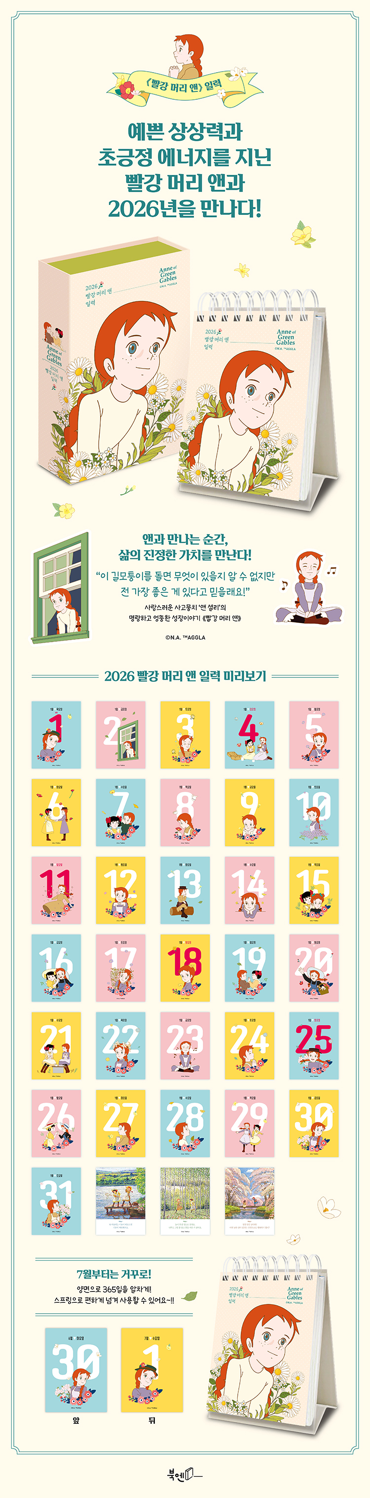 《2026년 빨강 머리 앤 일력》은 매 페이지마다 빨강 머리 앤의 사랑스럽고 감동 넘치는 일러스트가 그려져 있습니다. 스프링으로 편하게 넘겨 사용할 수 있고, 일력의 보관 케이스도 함께 구성해 소장 가치를 높였습니다.