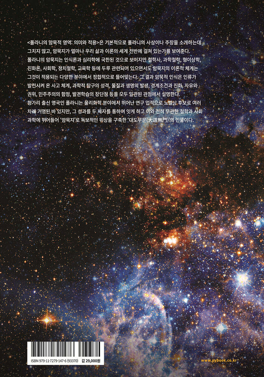 의욕에는 늘 현실적인 제약이 따른다. 우리나라 출판계는 웬만한 학술서적을 번역해 내지 않는다. 출판사 입장에서 비싼 저작권료도 있지만 독자들의 수요가 많지 않기 때문이다. 하지만 나의 ‘생떼’에 반대급부로 출판사는 번역서에 합당한 ‘해설서’ 집필을 제안하였다. 시장성도 있고 일반인에게 번역한 대작을 ‘친절하게’ 소개하는 안내서를 만들어달라는 요청이었다. 해설서를 어떻게 쓰는 것인지도 모르거니와 뜻하는 바도 아닌 듯하여 ‘마음속으로’ 거절하였다. 그러다가 〈암묵적 영역〉을 이런저런 식으로 소개하는 과정에서 준비한 노트를 모아 출판사의 요구에 따르기로 하였다. 이 책의 제2장은 내가 번역한 〈암묵적 영역〉을 중심으로 20세기 위대한 석학 마이클 폴라니를 소개하고자 한 노트를 토대로 구성한 것이다. 이것이 불씨가 되어 여기저기 널린 노트에 폴라니의 다른 저서를 탐독하면서 해설서가 아닌 다른 형태로 책을 내기로 하였다. 이것이 〈폴라니의 암묵적 영역: 의미와 적용〉의 탄생 동기다. 하지만 어떻게 보아도 이 책은 나의 번역서 〈암묵적 영역〉의 해설서가 아니다. 폴라니의 암묵지를 이해하기 위한 설명이 상당히 포함되어 있으므로 해설서가 아니라고 할 수는 없다. 하지만 이 책은 폴라니의 암묵지가 우리 삶과 세계에 차지하는 비중과 여러 영역에 걸쳐 있는 정합성을 보여주는 데 초점이 맞추어져 있다. 폴라니의 암묵지는 인식론과 심리학에 국한된 것으로 보이지만 철학사, 과학철학, 형이상학, 역사학, 진화론, 사회학, 정치철학, 교육학 등에 두루 관련되어 있다. 이처럼 폴라니의 암묵지 이론 체계는 다양한 분야에서 정합적으로 들어맞는다. 암묵적 기제의 작동은 인류가 발전시켜 온 사고 체계, 과학적 탐구의 성격, 물질과 생명의 발생, 경계조건과 진화, 자유와 권위, 민주주의의 함정, 발견학습의 장단점 등을 모두 설명한다. 집필 과정에서 나의 이러한 확신은 강화되었다. 사적인 변명 말고 내게는 책을 내게 된 또 다른 사연이 있다. 폴라니는 우리나라에서 그의 학문적 위상과 비중에 걸맞지 않게 미흡하거나 어긋난 방향에서 소개되었다. 어떤 개념은 핵심 개념인데도 뜻이 전달되지 않을 만큼 어색하게 번역되었다. 학술지에 게재된 상당수 논문에서 언급된 폴라니는 엉뚱한 맥락에서 다뤄지기도 하였다. 또 그의 학문적 위상이 오도되기도 하였다. 비언어적 지식을 강조한 점에서 옥스퍼드의 라일 교수가 주장하는 ‘방법적 지식’이 폴라니의 암묵지와 유사해 보인다고 해서 동일시해선 안 된다. 두 사람이 주장하는 실상은 정반대다. 암묵지가 우리 인식을 고양하는 과정을 포퍼의 끊임없이 이어지는 ‘추측과 반박’으로 보는 것도 그릇된 이해다. 무엇보다도 폴라니가 인정했듯이 암묵지가 게슈탈트 심리학에 의존하였지만, 전적으로 동일하지 않다. 그럼에도 폴라니는 우리에게 매우 친숙한 인물이다. 인터넷을 검색하면 여러 방면에서 폴라니의 아이디어를 어렵지 않게 확인할 수 있다. 하지만 일부 전공 분야에서 엉뚱한 방향으로 소개되어 안타까울 뿐이다. 이 책이 폴라니를 제대로 이해하는 길잡이가 되길 바라는 마음이다. 당초에 얇은 분량의 책을 낼 생각이었으나 집필 과정에서 양이 기대 이상으로 증가하였다. 그럼에도 많아 보이는 양 속에서 다루지 못한 분야와 더 심층적으로 다루지 못한 내용이 있다. 하지만 나의 협량狹量으로 더 이상의 만용을 부리지 않기로 하였다. 다소 많은 분량에 독자들이 지루할지 우려된다. 폴라니 주장의 대강을 먼저 알고 싶은 독자는 프롤로그, 제1장, 제2장 그리고 제15장을 먼저 읽고 나서 마음에 끌리는 장을 선택해 읽어도 좋을 듯하다. 각 장이 독립적일 만큼 중요한 내용이 중복되는 경우가 있다. 그렇다고 이 책의 구성에 체계가 없다는 말은 아니다. 각 장은 주제별로 나누었지만, 폴라니의 ‘암묵지’를 매개로 하여 서로 관련을 맺고 있다. 각 장에 수록된 미주가 연결점을 마련해 주고, 뒤에 붙은 색인은 책 전체를 조망하는 데 도움을 줄 것이다. 폴라니를 심층적으로 이해하거나 석박사 논문을 준비하고자 하는 독자는 전체를 면밀하게 읽기를 바란다. 약간의 인내심을 갖고 읽다 보면 폴라니에 대한 오해를 털어내고 남다르게 전개하는 그의 창의적이고 정합적인 아이디어를 만나게 될 것으로 믿는다. 독자들에게 이 책을 〈암묵적 영역〉의 개정 번역판과 함께 읽기를 권한다. 〈암묵적 영역〉은 폴라니의 생전 가장 나중에 나온 저술로 분량도 많지 않고 그의 사상이 잘 집대성된 책이다. 실제로 이 책에서 인용된 내용의 상당 부분은 일차적으로 〈암묵적 영역〉 개정 번역판에 의존하였다. 또 10년 전 세상에 나온 초판에 비하여 독자들의 이해에 도움을 주고자 역자가 나름대로 ‘개정’ 노력을 기울였다. 〈암묵적 영역〉 개정 번역판과 더불어 책을 읽는 기쁨이 증폭될 것이다. 책을 내어 기쁘다. 부족한 점이 많겠지만 독자들의 사랑을 듬뿍 받았으면 좋겠다. 나는 잘못 알려진 폴라니가 온전하게 이해되는 것이 여러 가지 면에서 독자에게 진정한 이익이 된다고 믿는다. 책을 펴낸 박영