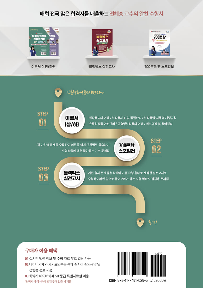 01. 화장품법 10 02. 개인정보 보호법 77 PART 2 화장품 제조 및 품질관리 01. 화장품 원료의 종류와 특성 104 02. ISO 16128 천연, 유기농지수 표시 140 03. 기능성화장품 142 04. 화장품의 기능과 품질 168 05. 화장품 사용제한 원료 175 06. 화장품 관리 231 07. 위해사례 판단 및 보고 242 PART 3 부록 01. 화장품법 256 02. 화장품법 시행령 275 03. 화장품법 시행령 [별표 1] 278 04. 화장품법 시행규칙 280 05. 화장품법 시행규칙 [별표 7] 304 06. 테르펜 312 07. 화장품유형별 효과 313 08. 개인정보 보호법 331 09. 개인정보 보호법 시행령 378 |
