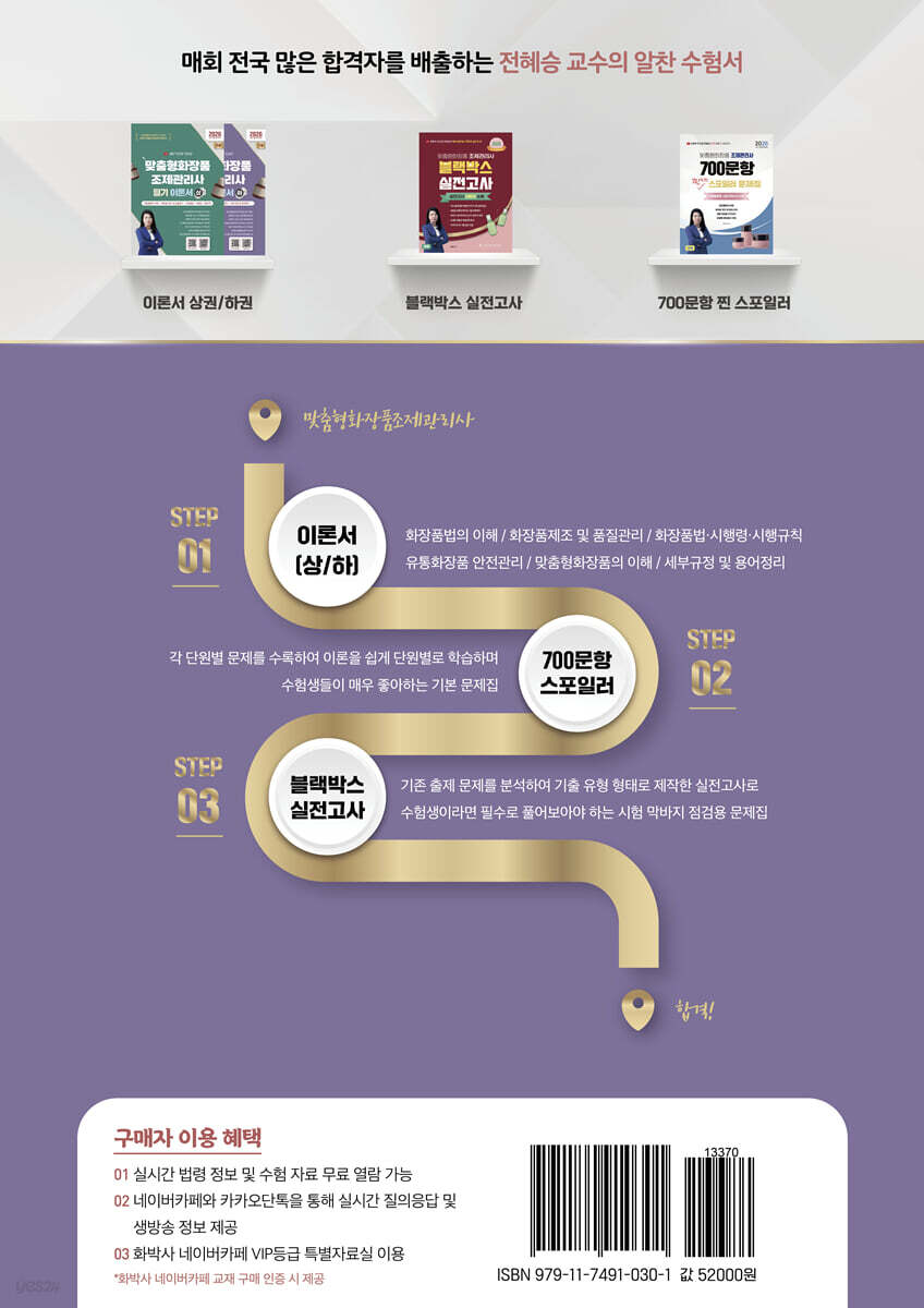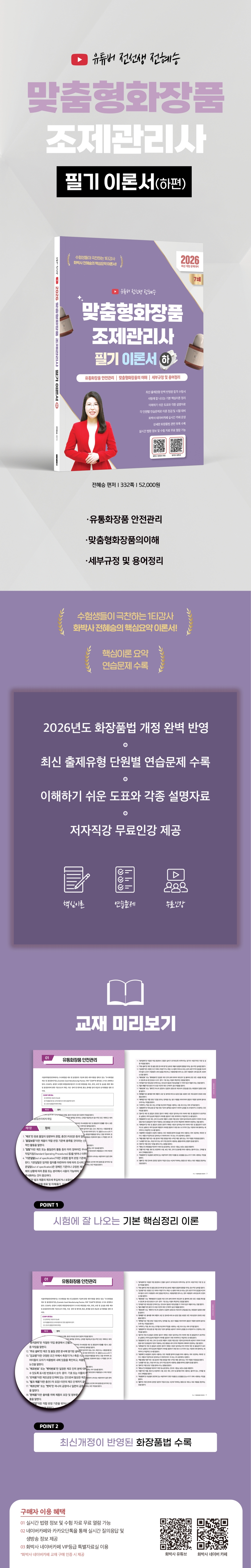 01. 유통화장품 안전관리 6 02. 작업장 시설기준 및 위생관리 14 03. 맞춤형화장품 위생관리 42 04. 내용물 및 원료관리 45 05. 포장재의 관리 77 PART 2 맞춤형화장품의 이해 01. 맞춤형화장품 개요 112 02. 피부 및 모발 생리구조 131 03. 관능평가방법과 절차 163 04. 제품상담 167 PART 3 부록 01. 수입화장품 품질검사 면제에 관한 규정 174 02. 기능성화장품 심사에 관한 규정 176 03. [별표4] 유통화장품 안전관리, 시험방법(제6조 관련) 199 04. [별표1] 화장품 표시·광고 관리 가이드라인(민원인 안내서) 227 05. 화장품 인체적용시험 및 효력 시험 가이드라인 231 06. 우수화장품 제조 및 품질관리기준 235 07. CGMP 해설서 246 08. 용어정리 330 |