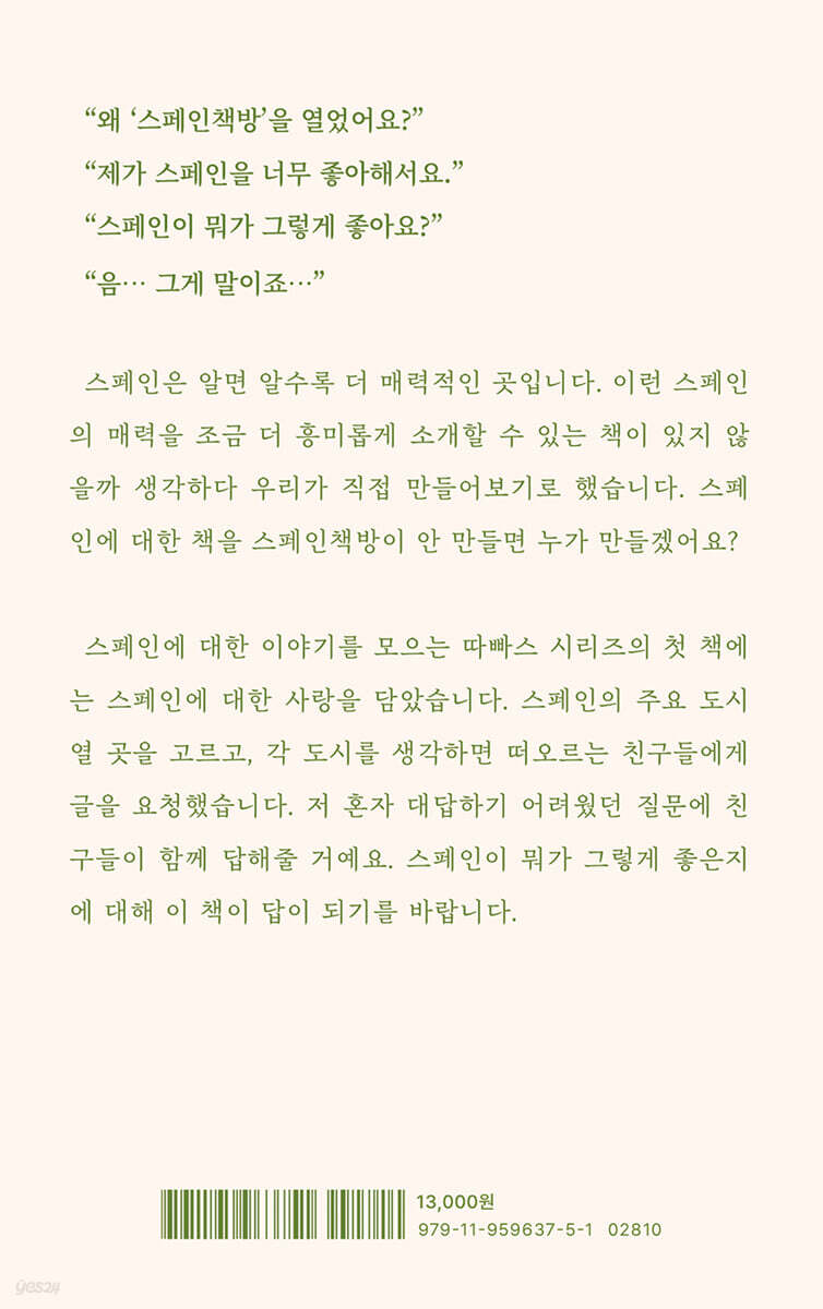 시리즈의 이름은 스페인의 음식 문화인 ‘따빠스(Tapas)'에서 따왔다. 따빠스는 특정한 하나의 음식이 아닌, 접시에 조그맣게 담겨 나오거나 다양한 재료를 꼬치로 꽂은 다채로운 요리를 총칭하는 말이다. 이 책 역시 스페인의 10개 주요 도시를 중심으로, 그 도시를 떠올리는 필자들의 작고 흥미로운 이야기들을 모아 독자에게 스페인을 다채롭고 맛있게 느낄 수 있도록 구성했다. 10개의 도시, 10개의 사랑, 그리고 하나의 문장! 이 책은 단순히 도시를 소개하는 것을 넘어, 스페인 각 도시와 사랑에 빠진 순간을 담은 고백이다. 책 속 10편의 글 모두에 이 책의 제목과 같은 문장(“그때 나는 이 도시와 사랑에 빠졌다.”)이 등장한다. 독자들은 글 속에서 이 문장을 만날 때마다, 작가가 어떤 순간에 스페인의 한 도시에 마음을 빼앗겼는지를 느끼게 될 것이다. 글의 어디쯤에서 이 문장을 만나게 될지를 기대하며 글을 따라가는 여정은, 독자들에게 도시의 사랑스러움을 곱씹게 하는 숨겨진 게임이자 또 하나의 낭만적인 재미가 될 것이다. 이 반복되는 고백을 따라가며 스페인 도시와 사랑에 빠지는 순간을 발견하게 되기를 바란다. - 따빠스 시리즈 tapas series - 스페인에 대한 작고 다양한 이야기를 모읍니다. 무엇이든 올리면 맛있어지는 스페인의 따빠스처럼 스페인의 다채로운 매력을 흥미롭게 조합하여 선보입니다. 이 작은 책이 당신에게 가장 맛있는 스페인이 되기를 바랍니다. |