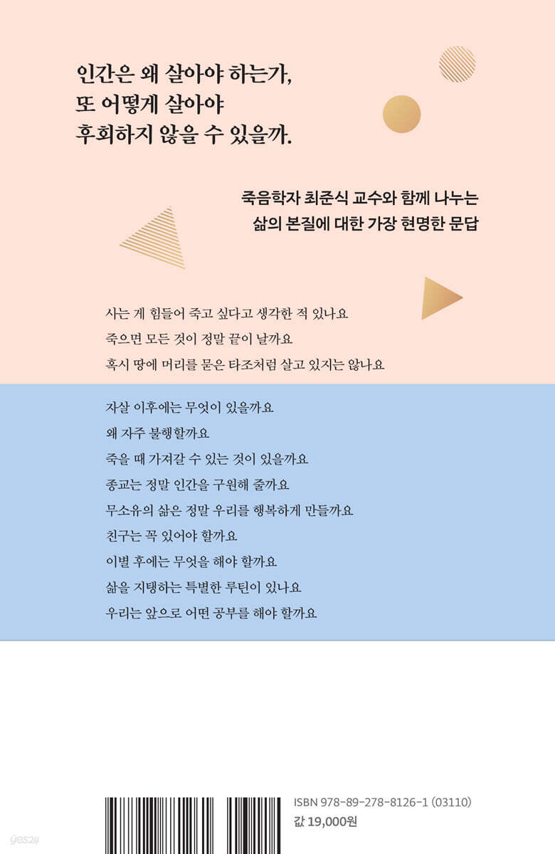 1장 단 한 번이라도 죽고 싶다,는 생각을 해본 당신에게 _자살 권하는 사회 사는 게 힘들어 죽고 싶다고 생각한 적 있나요 그 절박한 마음에서 무엇을 발견할 수 있을까요 마지막 순간, 당신은 어떤 밧줄을 붙잡을 수 있을까요 죽으면 모든 것이 정말 끝이 날까요 사람의 목숨은 단숨에 자를 수 있는 것인가요 죽으면 ‘나’는 바로 사라질까요 혹시 땅에 머리를 묻은 타조처럼 살고 있지는 않나요 독수리처럼 사는 삶이란 어떤 걸까요 지구학교에서 자퇴하는 삶이란 자살 이후에는 무엇이 있을까요 자살은 남은 자들의 등에 칼을 꽂는 행위인가요 2장 인생은 결코 한 방이 아닙니다_삶과 죽음의 본질에 대하여 우리는 왜 일상이 행복하지 않다고 생각할까요 왜 늘 성공을 강요당하는 걸까요 왜 자주 불행할까요 매번 왜 누군가를 미워하게 될까요 상대는 정말 나를 비추는 거울일까요 왜 늘 죽음을 생각하며 살아야 할까요 죽을 때 가져갈 수 있는 것이 있을까요 누군가를 공격하지 않고, 껴안을 수 있는 삶이 가능할까요 우리는 왜 죽음에 대한 이야기를 꺼릴까요 한국 사회에 뿌리내린 유교 문화에 대해 무엇을 알아야 할까요 유교가 죽음을 금기시한다면, 제사나 차례 문화는 왜 있는 걸까요 그렇다면 우리는 어디서 희망을 발견해야 할까요 우리는 인생에서 어떤 목표를 가져야 할까요 종교는 정말 인간을 구원해 줄까요 그렇다면 신을 섬기는 사람, 종교인은 어떻게 바라봐야 하는 걸까요 무소유의 삶은 정말 우리를 행복하게 만들까요 인간은 왜 돈과 부에 집착할까요 종교와 욕망은 어떤 관계가 있을까요 3장 혼자서 살아갈 수 있는 힘을 길러야 합니다_타인이라는 지옥에서 해방되는 법 타인은 정말 지옥일까요 인간에게 받은 상처는 대화나 조언으로 해결이 될까요 스스로가 고독하고, 보잘것없다고 느낄 때는 무엇을 해야 하나요 친구는 꼭 있어야 할까요 사람에 대한 기대감을 없애기가 힘이 든다면 자존감은 어떻게 키우나요 왜 외로워서 죽겠다,는 말을 반복할까요 갈등이 계속된다면 그 관계는 쉬어가야 합니다 왜 누군가에게 매번 속고, 섭섭해할까요 누군가를 왜 계속 원망하게 될까요 이별 후에는 무엇을 해야 할까요 당신의 장례식을 상상한 적 있나요 4장 마지막 순간까지 어떤 공부를 해야 할까요_당장 내일 세상을 떠나도 후회되지 않을 마음공부에 대하여 삶을 지탱하는 특별한 루틴이 있나요 우리는 자연에서 어떤 공부를 할 수 있을까요 동물은 인간에게 어떤 이야기를 들려주나요 가장 힘들 때 어떤 공부를 하겠다고 마음먹었나요 마음공부에는 명상이 가장 좋을까요 명상을 제대로 하려면 시간이 얼마나 걸리나요 요가와 명상에서 우리는 무엇을 얻을 수 있을까요 명상에 집중하려면 어떤 방법이 가장 효과적인가요 차크라가 뭔가요 호흡의 기본 방법은 뭔가요 어떤 책을 보는 게 좋을까요 어리석은 숟가락이 되지 말라, 무슨 의미인가요 우리는 앞으로 어떤 공부를 해야 할까요 켄 윌버에게서 어떤 가르침을 얻으셨나요 현대의 붓다라고 불리는 유지 크리슈나무르티는 어떤 인물인가요 나가며 |