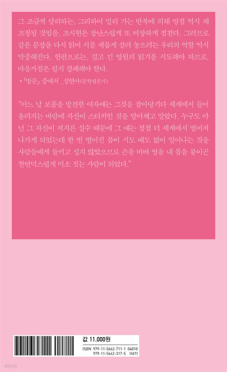 이것은 그런 식으로 고안된 장치입니다. 나는 오늘 당신을 안내하게 될 인공영혼이며 당신이 이 글을 읽는 동안만 간헐적으로 살아있을 수 있습니 다. --- 「시뮬레이션 제 4138회차」 중에서 어딘가에서 항상 폭풍이 불고 있어서 좋다고 말하기는 어려운 날씨 매일 편지가 담긴 깡통들이 떠밀려 내려와 쓰고 싶었던 걸까, 닿고 싶었던 걸까 --- 「파이럿」 중에서 그러나 이 시의 초고를 본 어떤 애는 나에게 사귀자고 했어요 처음 이 시에는 사후피임약이라는 단어가 들어 가 있었고 네 안에 뭔가 타고 있는 게 있다 내가 그걸 봤다 진정성 나는 너 같이 솔직한 애들이 좋더라 내가 너를 이해할 것 같더라 걔가 그렇게 말했었는데 --- 「진실없음」 중에서 우주는 슬슬 골칫거리가 되어가고 있었다 한 두 방울 튄 얼룩이 그런 식으로 불어날 거란 걸 누구도 가르쳐 주지 않았기 때문이야 --- 「우주조립키트」 중에서 이 시집을 다시 보기 하거나 이로부터 로그아웃해버릴 수도 있다. 그러나 로그아웃한 세계에서도 조시현의 시에서 완전히 자유로워질 수는 없을 것이다. 읽음은 내면에 얼룩을 남기고 우리의 영혼은 흔적을 기억하면서 조금씩 변화한다. 그것이 바로 멸망이 들이닥쳐도 그 이후의 영원으로 뻗어가는 길. ‘있음’을 거듭하면서 미세하게 달라진 반복으로 ‘함께 있음’을 도모하는 일. “영원히 읽기를 멈추지 않을 수도 있습니다.” (「시뮬레이션 제 4138회차」) --- 「발문 『이토록 못 미더운 지구 관찰자로부터 배우는 지구 독해법, 성현아(문학평론가)』」 중에서 |