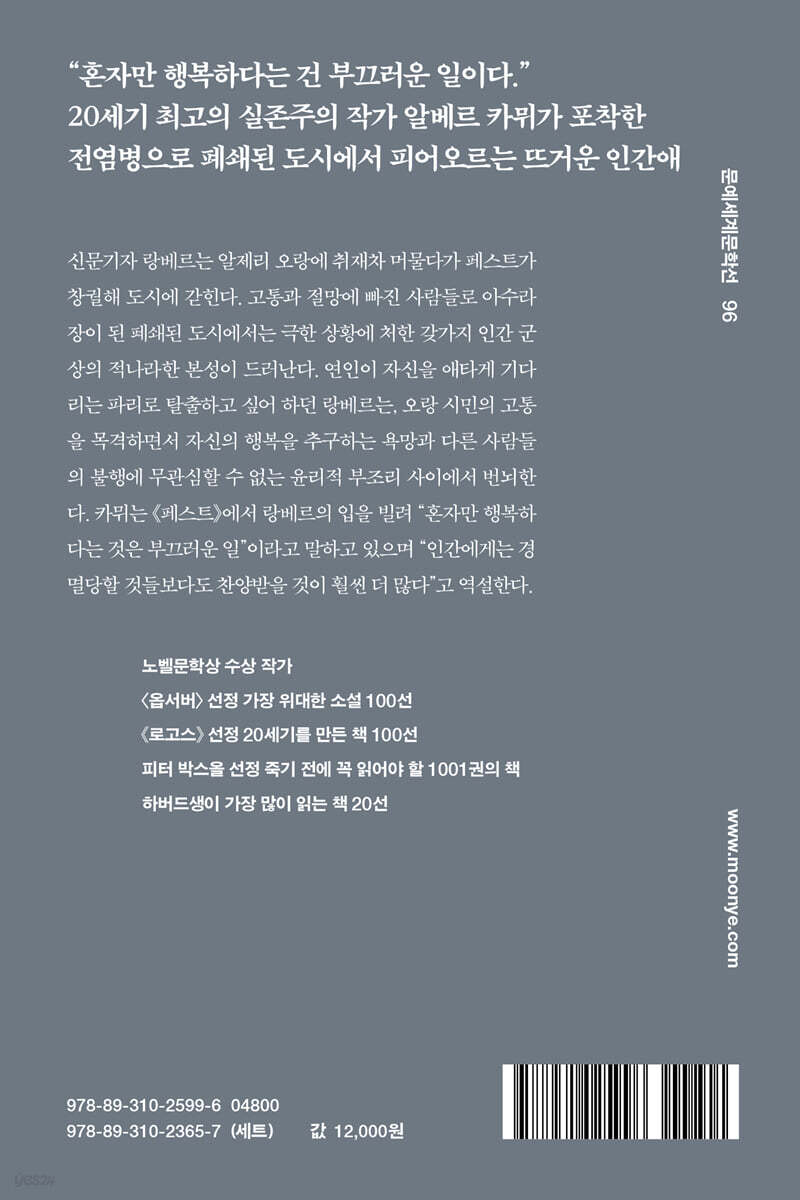 전염병으로 폐쇄된 도시에서 피어오르는 뜨거운 인간애 1947년 발표된 알베르 카뮈의 《페스트》는 제2차 세계 대전 직후의 세계가 겪었던 도덕적 붕괴와 실존적 불안을 압축한 소설이다. 신문기자 랑베르는 알제리 오랑에 취재차 머물다가 페스트가 창궐해 도시에 갇힌다. 고통과 절망에 빠진 사람들로 아수라장이 된 폐쇄된 도시에서는 극한 상황에 처한 갖가지 인간 군상의 적나라한 본성이 드러난다. 랑베르는 오랑 시민의 고통을 목격하면서, 자신의 행복을 추구하는 욕망과 다른 사람들의 불행에 무관심할 수 없는 윤리적 부조리 사이에서 번뇌한다. ‘페스트’는 곧 파시즘과 전체주의, 인간의 무관심이 만들어낸 도덕적 전염, 세계의 부조리함 등으로 인간이 겪는 고통의 상징이다. 카뮈는 랑베르의 입을 빌려 “혼자만 행복하다는 것은 부끄러운 일”이라고 말하며, “절망 속에서도 인간다움은 유지될 수 있는가”라는 인간 존재의 의의를 묻는다. 이러한 주제 의식에는 당대 철학·문학의 사조였던 실존주의가 강하게 반영되어 있다. 카뮈는 ‘부조리의 윤리’를 통해 인간의 한계를 자각하면서도, 고통과 절망 속에서도 인간다움을 놓지 않는 ‘반항하는 인간’을 제시해 실존의 의미를 제기한다. 재앙의 도시에서 인간 존엄의 최후 보루를 그리다 절망 속에서도 꺼지지 않는 인간성과 연대 소설은 북아프리카의 프랑스 식민지 도시 오랑에서 시작된다. 어느 날 거리 곳곳에서 죽은 쥐들이 발견되고, 이어 사람들에게 괴질이 퍼지기 시작한다. 처음엔 일시적 현상으로 여겨졌으나, 곧 사람의 목숨을 앗아가는 심각한 전염병이 퍼지고 있다는 사실이 밝혀져 도시 전체가 봉쇄된다. 눈에 보이지도 않는 병마로 사람들이 차례차례 죽어가는 와중에 외부와의 연락마저 끊기자, 사람들은 서로를 의심하며 공포와 무기력에 빠진다. 이 재앙의 한가운데서 카뮈는 여러 인물을 등장시켜, 부조리를 마주하는 다양한 인간 군상을 연출한다. 주인공인 랑베르는 파리에서 자신을 기다리는 연인과 재회하기 위해 탈출을 시도하지만, 고통받는 시민들을 보며 윤리적 문제로 고뇌하다 오랑에 남아 다른 이들과 함께 방역 활동에 참여하기로 한다. 의사 리외는 이성을 잃지 않고 환자를 돌보며, 의사이자 인간으로서 자신이 해야 할 의무를 다한다. 신부 파늘루는 처음에는 페스트를 ‘신의 징벌’로 해석하지만, 무고한 아이의 죽음을 목격한 뒤 신의 뜻에 의문을 품는다. 그리고 일반 시민인 타루는 어떤 명분도 없이, 단지 인간의 고통을 줄이기 위해 싸운다. 절망 속에서도 연대와 행위를 택하는 이, 신념의 한계에 부딪혀 좌절하는 이, 개인적 욕망과 공동체적 책임 사이에서 흔들리는 이 등, 《페스트》의 다양한 인물상은 부조리를 인식한 후 인간이 어떤 선택을 하는지 뚜렷하게 드러낸다. 페스트가 끝나갈 무렵, 도시에는 일시적인 환희가 찾아오지만 리외는 그 기쁨이 허망함을 안다. 그는 말한다. “페스트균은 결코 사라지지 않으며” “방이나 지하실이나 트렁크나 손수건이나 헌 종이 같은 것들 틈에서 꾸준히 살아남아” 언제고 인류의 행복을 위협할 수 있다는 생각에 잠긴다(334쪽). 이 결말은 악과 부조리는 언제든 되살아날 수 있다는 엄중한 경고다. 그러나 카뮈는 그 결말에 “인간에게는 경멸당할 것들보다도 찬양받을 것이 훨씬 더 많다”라는 말을 함께 넣어, 이 재앙을 헤쳐 나가기 위해서는 인간의 존엄성과 시민 간의 연대가 필요함을 상기한다. 부조리 앞에 무너질 것인가, 그에 맞서 실존할 것인가 카뮈 철학의 정수, ‘반항하는 인간’의 초상 《페스트》는 카뮈 철학의 핵심 개념인 ‘부조리’와 ‘반항’을 소설로 구현한 작품이다. 카뮈는 인간이 본질적으로 모순을 안은 존재라고 보았다. 인간은 이성적 존재로서 “합리적 욕망이 있는 까닭에 세계의 뜻을 알아보고자” 하지만, “세계에는 인간의 이성으로서 알아볼 수 있을 만한 아무런 뜻도 없다”(337쪽). 부조리란 인간의 합리적 욕망과 세계의 몰이해가 충돌하며 생기는 모순이며, 인간이 세계를 살아가며 겪을 수밖에 없는 숙명이다. 《페스트》의 오랑은 바로 그 부조리가 집약된 현장이다. 인간은 질병의 원인을 알지 못한 채, 그저 죽음을 기다리거나 싸워야 한다. 하지만 카뮈는 인간이 어찌할 수 없는 현실을 마주하고도 허무주의에 빠지지 않을 수 있다고 말한다. 그는 인간이 부조리 속에서 살아가야 함을 인식하고, 그 부조리에 맞서며 자신의 의지를 펼 때 비로소 인간으로서 실존한다고 보았다. 이렇게 부조리를 회피하는 대신 삶을 긍정하는 태도가 바로 카뮈가 말하는 ‘반항’이다. 카뮈는 무의미한 상황 속에서도 인간이 자신이 직접 선택하고 행동하며 의미를 창조할 수 있다고 믿었다. 또한, 카뮈는 이 소설을 통해 인간의 연대를 윤리의 새로운 기반으로 제시한다. 소설 속 등장인물은 서로 다른 세계관을 넘어 페스트에 맞서기 위해 하나 되어 행동한다. 카뮈에게 연대는 감정적 동정이 아니라, 부조리한 현실을 함께 인식하고 공동으로 맞서는 윤리적 결단이다. 인간은 홀로 의미를 창조하는 존재가 아니라, 타인의 고통을 인