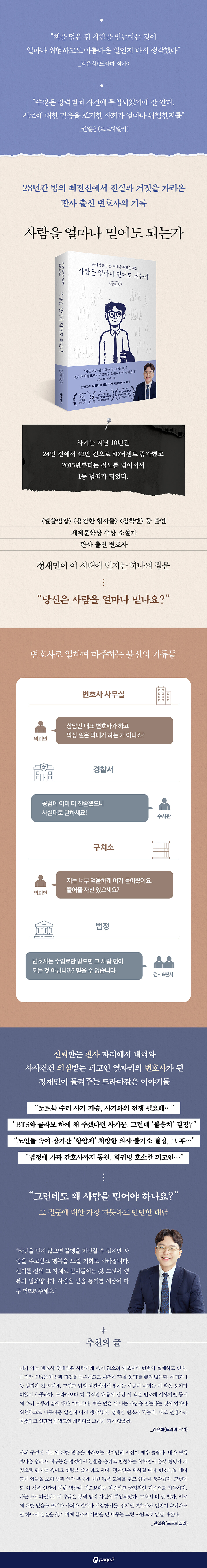 1장. 변호사 사무실에서_변호사의 인연법을 배우며 음악이 흐르는 사무실 | 패키지여행에서 자유여행으로 | 판사를 그만둔 이유 | 변호사의 인연법 | 사기당하는 사기 전문 변호사 | 사람을 몇 프로 믿고 살아야 하는가 | 소수의 사건만 맡는 이유 | 법률 장인 공방을 추구하며 | 히말라야의 셰르파처럼 | 정신분석가의 카우치처럼 | 인공지능이 못하는 것, 믿음을 주고받기 2장. 경찰서에서_배트맨을 생각하며 경찰에 대한 상반된 이미지들 | 어린 시절 기억 속 경찰 | 경찰과 검찰 사이 | 내가 경찰 조사에 꼭 참석하는 이유 | 수사로 진실을 밝힌다는 말 | 사기가 판치는 세상 | 노트북 수리 사기를 당하다 | 사기꾼 검거가 어려운 이유 | 순진하게 정의를 굳건히 믿었던 시절 | 배트맨을 생각하며 3장. 구치소에서_쇠창살 안에서 희망을 말하며 어느 피의자의 긴급체포부터 구속까지 | 구치소 가는 길 | 구속되면 커피를 마실 수 있을까 | 수용자에게도 부모가 있다 | 변호사는 집사가 아니다 | 자신 없는 변호사가 될 때 | 때로 교화되는 사람도 있다 | 낙원의 감옥 4장. 법정에서_재판을 하다가 재판을 받으며 변호인의 출석을 확인하겠습니다 | 공소사실의 요지를 말씀해 주십시오 | 피고인, 공소사실을 인정하십니까 | 증거 인부를 해 주십시오 | 증인도 불신의 대상이다 | MR을 제거하고 가사만 비교하는 일 | 최후 변론을 시작하겠습니다 | 합리적 의심을 넘어서 | 양형을 정하는 기준 | 전관예우라는 믿음으로 인한 불신 | 선고일에 느끼는 감정 | 법정은 믿음과 불신의 대립으로 떠받쳐진 세계 에필로그 |