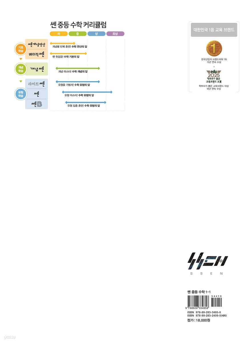 학교 시험에 나오는 모든 문제가 다 들어 있는 “문제 기본서 쎈” 쎈은 개념 학습 이후의 수학 학습 방법으로 유형별 문제 학습을 선도적으로 제안하며 등장하여 최고의 자리를 지키고 있는 수학 문제 기본서의 대표 주자입니다. 보유하고 있는 방대한 데이터베이스와 인프라를 바탕으로 한 쎈의 유형 분석과 문제해결 방법은 어떤 교재도 따라올 수 없는 특별함이 있습니다. 이것이 유사한 교재들 속에서도 쎈이 최고의 자리에 있는 이유입니다. 최적의 유형 학습을 통한 실제 문제해결 능력을 기르는 쎈, 수학의 답은 쎈입니다! 1. 2022 개정 교육과정을 충실히 반영 2. A, B, C 3단계 수준별 학습 체제로 학습 효과 극대화 3. 최신 학교 시험 기출 문제를 수록하여 빈출&신유형 대비 가능 4. 융합적 사고력 향상을 위한 창의 문제 수록 |
