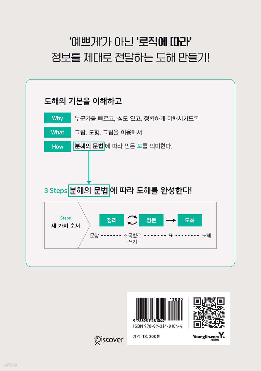 내가 만든 자료 돌아보기 시작하면서 제1장 도해의 Why&What ① ‘도’와 ‘도해’를 구분하기 우리 주변에는 도가 넘쳐나고 있다 무엇이 도이고, 무엇이 도해인가? 도와 도해의 차이는? 도와 도해의 차이 정의하기 도와 도해의 차이 ① 목적 : 왜 만드는가? (Why) 도와 도해의 차이 ② 요소 : 무엇을 사용하여 만드는가? (What) 세 가지 요소 ① 글자 세 가지 요소 ② 도형 세 가지 요소 ③ 그림 도와 도해의 차이 ③ 방법 : 어떻게 만드는가? (How) 도해의 정의 도해 정의의 가치 제2장 도해의 Why&What ② ‘알기 쉬운 도해’를 정의하다 도해의 핵심은 분해의 문법에 있다 알기 쉬움은 나누기 쉽다는 뜻이다 나누기 쉬움은 차이를 두기 쉽다는 뜻이다 나누기 쉽도록 정보를 분해한다 정보 나누는 법에는 문법이 있다 [보강] ‘안다’와 ‘이해하다’의 차이 제3장 도해의 HOW ① 도해화를 위한 사고 과정 알기 쉬운 도해의 축, ‘분해의 문법’이란? 세상은 요소와 관계로 이루어져 있다 도해 작성을 위한 세 가지 순서: ‘정리’ ‘정돈’ ‘도화’ 정리와 정돈의 차이 Step 1 : 정리 Step 2 : 정돈 Step 3 : 도화 도해 작성을 위한 두 가지 기준 기준 1 : 눈을 따른다 ‘눈을 따른다’ 기준의 예 ① : 폰트 사이즈 ‘눈을 따른다’ 기준의 예 ② : 콘트라스트(대비) ‘눈을 따른다’ 기준의 예 ③ : 색각 다양성 기준 2 : 뇌를 따른다 뇌를 따른다’ 기준의 예 ① : 콘트라스트(대비) ‘뇌를 따른다’ 기준의 예 ② : 게슈탈트 ‘뇌를 따른다’ 기준의 예 ③ : 착시 ‘뇌를 따른다’ 기준의 예 ④ : 시선 유도 ‘뇌를 따른다’ 기준의 예 ⑤ : 멘털 모델 제4장 도해의 HOW ② : 도해화를 위한 기본 형태 도해를 다스리는 아홉 개의 프레임 워크 도해 프레임 워크 9 ① 매트릭스(Matrix)|정보의 요소를 비교한다 ② 맵핑(Mapping)|정보의 요소를 비교한다 ③ 그래프(Graph)|정보의 요소를 비교한다 ④ 오일러(Euler)|정보의 관계를 구조화한다 ⑤ 트리(Tree)|정보의 관계를 구조화한다 ⑥ 피라미드(Pyramid)|정보의 관계를 구조화한다 ⑦ 코릴레이션(Correlation)|정보의 관계를 순서화한다 ⑧ 플로우(Flow)|정보의 관계를 순서화한다 ⑨ 사이클(Cycle)|정보의 관계를 순서화한다 ‘도해 프레임 워크 9’는 모두 ‘매트릭스’로 변환할 수 있다 ‘도해 프레임 워크 9’ 이외 형태의 대표 사례 마치면서 : 알기 쉬운 것의 가치와 폐해 부록 : 도해란 무엇인가? |