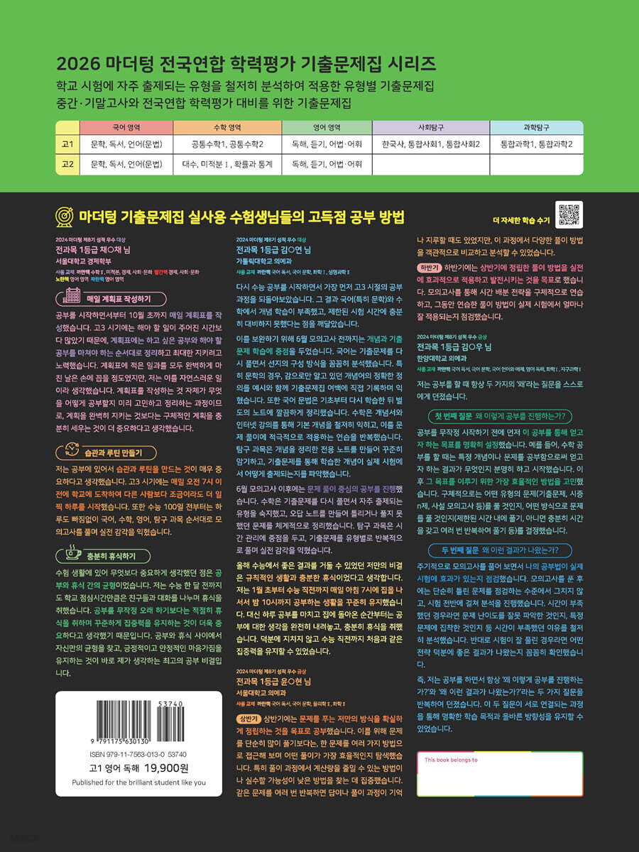 02 심경 변화 파악 03 필자의 주장 04 의미 추론 05 요지 추론 06 주제 추론 07 제목 추론 08 도표의 이해 09 내용 일치 파악 10 안내문 11 빈칸 추론 12 무관한 문장 찾기 13 문장 배열 14 주어진 문장 위치 파악 15 문단 요약 16 장문의 이해-단일지문 17 장문의 이해-복합지문 20분 미니모의고사 1회 20분 미니모의고사 2회 20분 미니모의고사 3회 20분 미니모의고사 4회 20분 미니모의고사 |