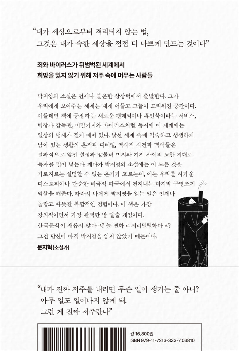 박지영의 소설은 언제나 불온한 상상력에서 출발한다. 그가 우리에게 보여주는 세계는 대개 어둡고 그늘이 드리워진 공간이다. 이를테면 책에 등장하는 새로운 팬데믹이나 휴먼북이라는 서비스, 벽장과 감독관, 비밀기지와 바이러스처럼. 동시에 이 세계에는 일상의 냄새가 짙게 배어 있다. 낯선 세계 속에 익숙하고 생생하게 남아 있는 생활의 흔적과 디테일, 역사적 사건과 맥락들은 결과적으로 앞선 설정과 맞물려 미지와 기지 사이의 묘한 지대로 독자를 밀어 넣는다. 게다가 박지영의 소설에는 이 모든 것을 가로지르는 설명할 수 없는 온기가 흐르는데, 이는 우리를 차가운 디스토피아나 단순한 비극적 파국에서 건져내는 마지막 구명조끼 역할을 해준다. 따라서 나에게 박지영을 읽는 일은 언제나 놀랍고 따뜻한 복합적인 경험이다. 이 책은 가장 창의적이면서 가장 완벽한 방 탈출 게임이다. 한국문학이 새롭지 않다고? 늘 뻔하고 지리멸렬하다고? 그건 당신이 아직 박지영을 읽지 않았기 때문이다. - 문지혁 (소설가, 번역가)