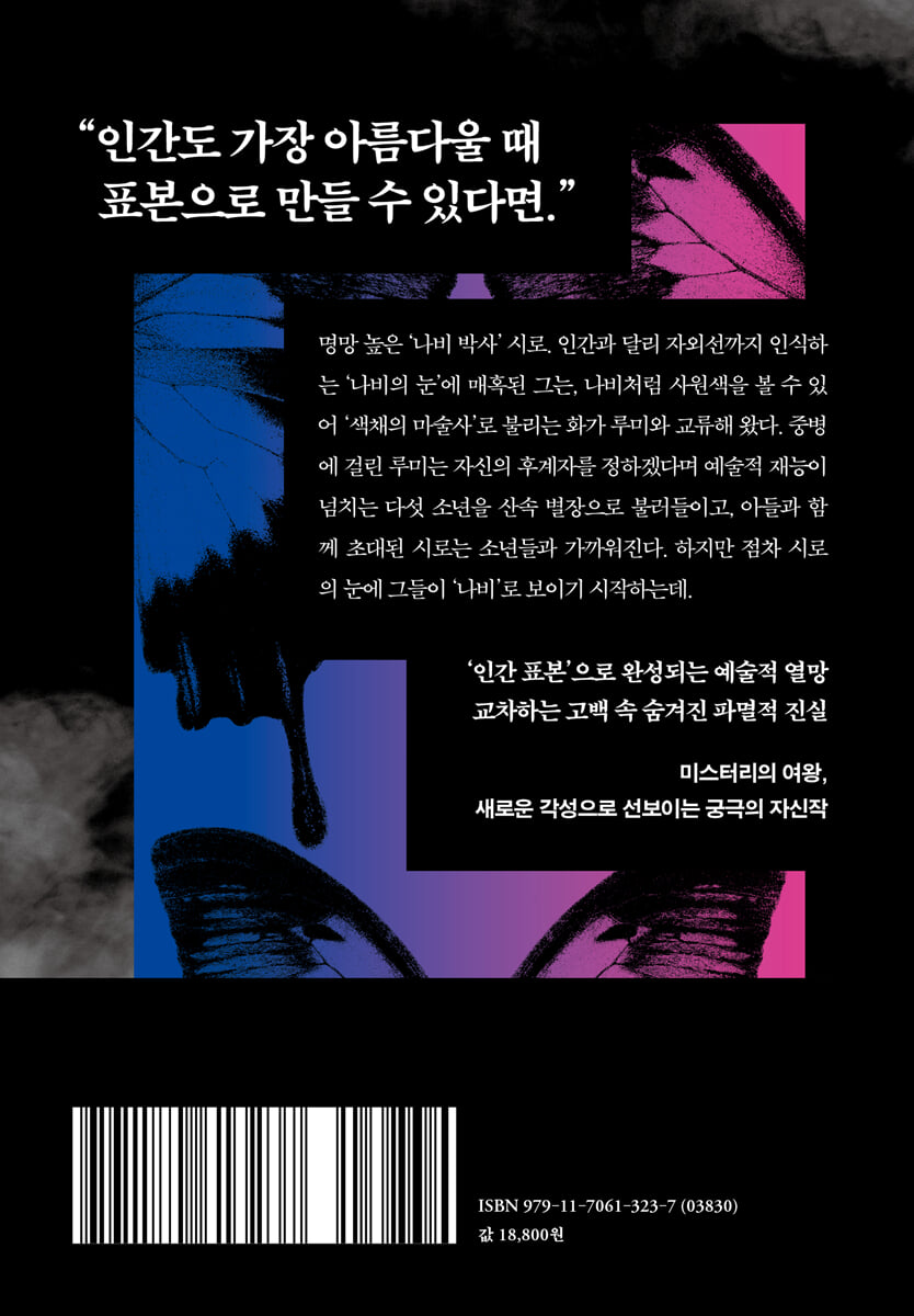 잘못 들은 게 아닐까 의심하면서 아버지를 쳐다보았지만, 아버지의 시선은 그림만 향하고 있었다. 인간 표본……. 아버지가 바로 지금 나비에게 한 작업을, 내가 당하고 있는 모습이 머릿속에 펼쳐졌다. 작업하고 있는 사람은, 아버지다. --- p.26 나비가 인간으로 모습을 바꾸어, 그 눈에 비친 세계를 그린다. 루미는 나비의 세계로 인도해 주는 안내자다. 그래서 나는 경외심을 담아 루미에게 이렇게 말했다. “너는 나비의 눈을 갖고 있구나.” 하지만 루미는 내 말을 싱그러운 웃음과 함께 부정했다. “내 눈은 내 거야. 전부 내 눈에 비치는 세계야. 나비도 분명 나보단 못할 거야.” --- pp.60-61 전류 같은 감각이 몸의 중심을 훑고 지나갔다. 인간 중에서는 내게만 보이는 이 세상에서 가장 아름다운 광경을 영원불변의 형태로 남겨서 한 명이라도 더 많은 사람들에게 보여주는 것이야말로……. 신이 내게 부여한 천명이 아닐까? --- p.77 그 눈을 갖지 못한 사람들 중에서 그 세계를 가장 잘 이해하는 것은 바로 나다. 루미의 후계자가 될 수 있는 건 내가 아닌가? 또 웃었다. 같은 나이에 후계자는 무슨. 그렇지만 내가 상상하는 작품은, 세상 모든 사람들이 비판하더라도 루미만은 높이 평가해 주지 않을까? 윤리관을 배제하고 순수하게 예술 작품으로 봐주지 않을까? 그 어린 시절 내 표본을 탐냈던 것처럼. 루미에게 바치는 작품을 만들자. --- p.83 다섯 개의 표본 제작은 전부 계획에 따른 것. 그렇기에 완벽하게 해냈다. 그런데 마지막 순간에 남은 후회 때문에 인생을 통째로 부정하게 될 수도 있었다. 그렇다면 스스로 종지부를 찍어야 한다. 모든 것을 능가하는 최고 걸작을 완성해서. 그렇다면 그건 누구의 표본일까? 답은 이미 알고 있었다. --- p.140 모든 준비를 마친 그날 밤, 함께 살던 거실에서 단둘이 서로를 마주 보았다. “너를 나비에 비유한다면 뭐라고 생각하니?” 이타루에게 물었다. “세소스트리스 사향제비나비려나?” 예상했던 답과 달랐다. “브라질에서 처음 잡았던 붉은무늬제비나비가 아니라?” “비유 대상과 좋아하는 건 서로 다르니까. 지금 좋아하는 건 남방제비나비고. 뭐, 알고 보면 나도 상당히 독을 가졌다는 뜻이야.” --- p.142 “그림을 장식할 게 아니라 우리가 예술적인 모습으로 케이스에 들어가면 더 재미있는 작품이 되지 않을까?” 그렇게 말하고는 케이스에 붙어 있던 보호 필름을 벗기고 세우더니 그 안에 들어가 프테라노돈이라고 하며 익룡 포즈를 취하는 것이었습니다. 그 순간, 정수리를 얻어맞은 듯한 충격과 함께 짜릿한 전율이 온몸으로 퍼져나갔습니다. 케이스 안의 이시오카 쇼가 휴잇슨 삼원색네발나비로 보였던 겁니다. 그 뒤에는 벽화가 있고, 그것을 뚫고 부화하는 배경까지 똑똑히 보였습니다. 실재하는 것, 눈에 보이는 것밖에 보지 못했던 제가, 세 번째 눈으로 느낀 광경을 본 것입니다. 이거야말로 ‘인간 표본’ 아닌가? 더군다나 신이 표본 대상자에게 준 선물이 무엇인지도 일목요연합니다. 이보다 더한 예술 작품이 어디 있을까……. --- pp.221-222 |