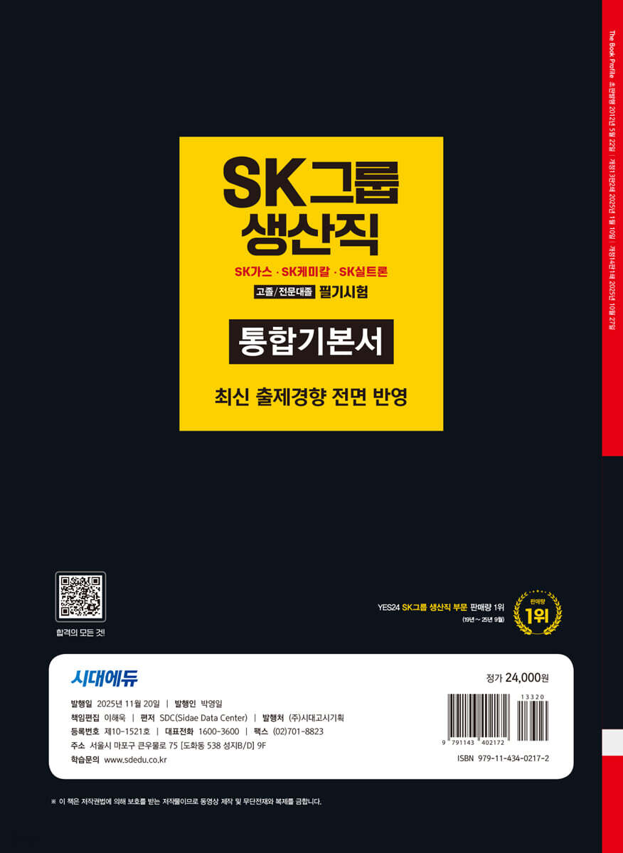 PART 1 기초지식 CHAPTER 01 영어 CHAPTER 02 수학 CHAPTER 03 한자성어 CHAPTER 04 회사상식 PART 2 언어이해 CHAPTER 01 언어추리 CHAPTER 02 언어유추 CHAPTER 03 언어논리 PART 3 패턴이해 CHAPTER 01 도형추리 CHAPTER 02 지각속도 PART 4 상황판단 PART 5 기초과학 CHAPTER 01 화학 CHAPTER 02 물리 PART 6 최종점검 모의고사 제1회 최종점검 모의고사 제2회 최종점검 모의고사 PART 7 인성검사 PART 8 면접 CHAPTER 01 면접 유형 및 실전 대책 CHAPTER 02 SK그룹 실제 면접 별 책 정답 및 해설 PART 1 기초지식 PART 2 언어이해 PART 3 패턴이해 PART 5 기초과학 PART 6 최종점검 모의고사 |