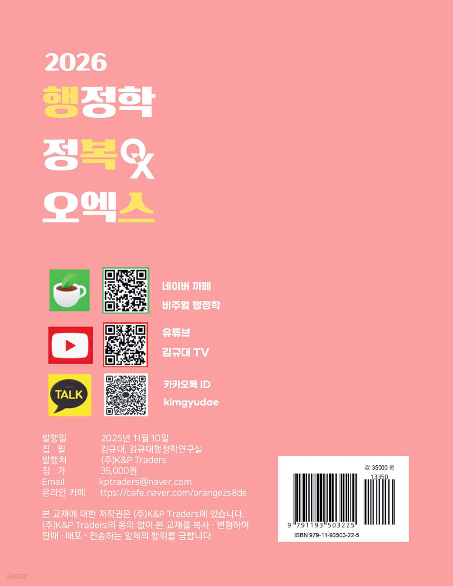 행정학의 바다에서 길을 찾고 계신 수험생 여러분 이 교재는 여러분의 행정학 학습을 보다 효율적이고 체계적으로 만들어줄 것입니다. 왼쪽 페이지에는 OX로 답할 수 있는 문제를, 오른쪽 페이지에는 그에 대한 정확한 해설과 정답 그리고 해당 개념을 요약 배치하여 빠른 학습과 깊이 있는 이해를 동시에 추구했습니다. 복잡하고 어려워 보이는 개념을 OX 문제를 통해 명확하게 정리할 수 있을 것입니다. 틀린 내용을 바로잡고, 옳은 내용을 강화하는 과정에서 여러분의 지식은 더욱 단단해질 것입니다. 이 교재는 행정학의 기본 개념부터 심화 내용까지 체계적으로 학습할 수 있도록 핵심 영역을 망라하여 선지를 구성하였습니다. 이 교재를 반복하여 숙지한다면 행정학의 틀과 내용의 흐름을 잡고 실제 출제되는 방법론에 대한 이해를 얻게 될 것입니다. 단원별 기출 1200제 그리고 기출 진도별 모의고사와 함께 공부하시면 더욱더 행정학을 입체적으로 공부할 수 있으실 것입니다. “여러분도 행정학을 정복하실 수 있습니다.” 처음 행정학을 접하시는 분들께서는 방대한 양을 암기하는 것에 대해 가장 걱정하십니다. 그리고 행정학이라는 과목 자체가 실생활에서 쉽게 접하는 부분이 아니고, 처음 배우다 보니 더 낯선 감정을 가지시는 것 같습니다. 저는 해당 내용이 눈앞에 잘 그려질 수 있어야 좋은 설명이라고 생각합니다. 그래서 항상 이 부분을 어떻게 설명해드리면 더 쉽게 이해하실까 끊임없이 고민하여 도식화로 행정학을 표현하고, 행정학 개념을 설명할 때 실생활에서 쉽게 접하실 수 있는 부분과 연계해서 설명을 해 드리려고 노력하고 있습니다. 이렇게 추상적인 이론을 현실적으로 피부에 와닿으시도록 시각화, 도식화 하는 과정을 저의 비주얼 행정학 커리큘럼에 담았고, 커리큘럼을 따라 비주얼 행정학만의 복습프로그램까지 진행하시다 보면 어느새 자연스럽게 행정학을 정복하실 것이라 확신합니다. “공부의 가속도가 붙는 것이 중요합니다.” 수험생들은 공부하다 보면 자신에게 끊임없이 “과연 내가 합격할 수 있을 것인가?”라는 의문을 갖게 됩니다. 이렇게 합격할 수 있을지에 대한 고민을 하다 보면 그 생각에 빠지게 되고, 더 불안하고 초조해지게 됩니다. 하지만 이런 생각을 하기보다는 “나는 반드시 합격한다. 다만 그 시간을 단축시킬 수 있는 방법은 무엇일까?”라는 앞을 향한 질문을 던지셔야 합니다. 처음 기출문제집을 공부하시다 보면 이런 문제들을 내가 과연 시험장에서 1분 안에 풀어낼 수 있을까라는 생각이 들 것입니다. 결론부터 말하자면 분명히 하실 수 있고, 실전에서 더 빨리 풀 수 있습니다. 공부의 가속도가 붙기 시작하면 나중에 그 속도는 어마어마하게 빨라집니다. 이제 본격적으로 출발선에 섰습니다. 달리십시오! 결승선에서 기쁨의 눈물을 흘릴 수 있는 멋진 주인공이 될 것입니다. 저도 여러분이 최대한 빠르게 결승선에 도달할 수 있도록 노력할 것이며, 이 책이 그 시간을 조금이나마 단축시켜 주기를 간절히 바라봅니다. “감사하고, 또 감사드립니다.” 이 교재가 출간되기까지 최선을 다해 노력해 주신 연구실 가족 여러분들께 진심으로 감사의 말씀 전합니다. 좋은 교재와 강의를 만들고 싶어하는 저의 바람을 항상 이해해 주시고 늘 같은 마음으로 지지해 주셔서 감사합니다. 그리고 항상 부족한 저에게 힘이 되어주는 저의 가족들에게도 진심으로 감사하다는 말씀 전합니다. 마지막으로, 절 믿어주시고, 선택해 주신 많은 분들께 합격이라는 행복만 드릴 수 있도록 최선을 다하는 김규대가 되겠습니다. 감사합니다. |