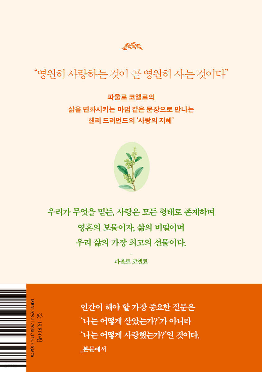 --- p.13 사랑은 우리로 하여금 중국어나 인도의 방언을 말할 수 있게 해주는 진정하고 유일한 세계어지요. 언젠가 여러분이 그곳에 간다면, 여러분은 사랑의 말 없는 웅변을 통해 모든 사람에게 이해받을 수 있을 것입니다. --- p.25 프리즘이 빛의 무지개색을 드러내듯, 그는 사랑의 무지개를 우리에게 보여줍니다. 그 요소들은 무엇일까요? 우리가 매일 듣고 삶의 매 순간에 행할 수 있는 미덕들입니다. --- pp.29-30 최고의 선물은 이 숨결을 반영합니다. 그것은 그 자체로 선물이 아니라, 평범한 하루하루를 구성하는 말과 행동들이 모여서 만들어지는 선물입니다. --- p.34 사랑이 발하는 빛보다 더 영광스러운 빛은 없기 때문이지요. “사랑은 언제까지나 스러지지 않습니다.” 사랑은 삶의 진정한 에너지입니다. --- p.40 기쁨을 줄 기회를 절대로 놓치지 마십시오. (…) “나는 이 세상에 딱 한 번 살다 갑니다. 그러니 내가 행할 수 있는 선이나 어떤 사람에게 베풀 수 있는 온유함을 지금 당장 행하십시오. 미루거나 소홀히 하지 마십시오. 나는 이 길을 또다시 지나가지 못할 테니까요.” --- p.42 사랑을 받아들이십시오. 기억하십시오. 이것은 삶과 죽음의 문제입니다. 나 자신을 사랑하지 못한다면, 여기 이렇게 서서 사랑에 대해 이야기하는 것은 아무런 의미도 없습니다. (…) 다시 말해, 사랑하지 않느니 살지 않는 편이 낫다는 겁니다. 사랑하지 않느니 차라리 살지 않는 편이 더 낫습니다. --- p.66 빛은 그 구성 요소들의 총합보다 큽니다. 빛은 우주에서 반짝이는 어떤 것이니까요. 그리고 사랑도 그 구성 요소들의 총합보다 훨씬 더 큽니다. 사랑은 살아 있고, 고동치며, 신성한 것이니까요. --- p.83 모든 나라의 모든 화폐가 쓸모없어지고 가치 없어질 때, 사랑은 우주에서 여전히 받아들여지는 유일한 화폐가 될 것입니다. --- p.101 사랑은 생명입니다. 사랑은 언제까지나 스러지지 않으며, 사랑이 존재하는 한 생명도 스러지지 않지요. --- p.113 |