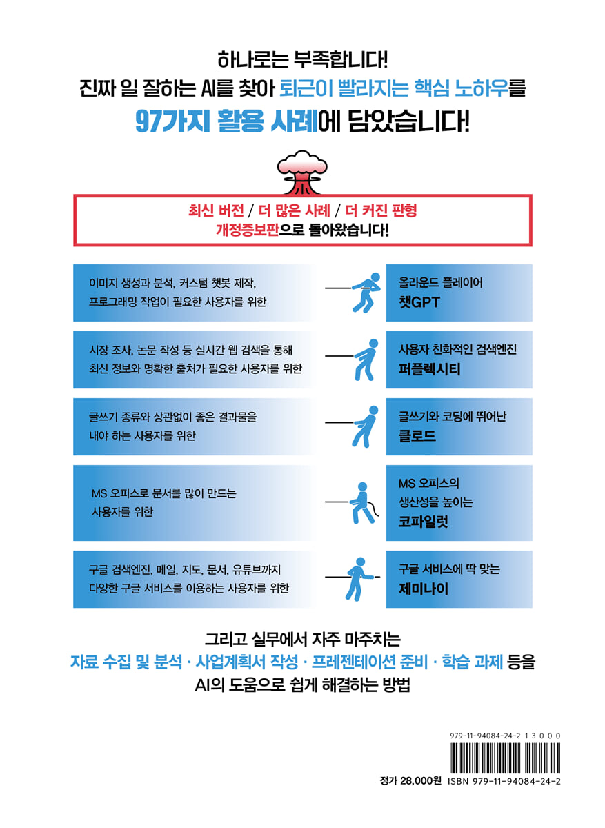 텍스트 생성형 AI의 활용 범위는 단순히 글 작성을 넘어선다. 마케팅 콘텐츠 제작, 고객 서비스 자동 응답 챗봇과 같이 나에게 아이디어만 있다면 무궁무진한 방법으로 활용할 수 있다. ★ 97개의 실제 예시로 안내하는 AI 선택 가이드 각각의 AI별로 실제 예시를 실어 독자들이 스스로 선택할 수 있도록 안내한다. 적재적소에 필요한 상황을 해법을 통해 AI별로 강점과 약점을 가감 없이 보여주므로 독자들은 선입견 없이 본인들에게 필요한 AI를 선택할 수 있다. ★ AI 활용, 이제 막막하지 않다! 나에게 꼭 필요한 AI를 선택하는 것이 무엇보다 중요하지만 이 AI를 조합해서 사용한다면 그보다 더 강력한 무기는 없을 것이다. 이 책의 마지막 PART에서는 정부에서 시행하는 예비창업패키지 사업에 지원할 사업계획서를 직접 작성해 보면서 다섯 가지 AI를 모두 사용해 본다. 이를 통해 AI를 조합해서 사용하는 스킬도 익힐 수 있다. ★ 또 다른 생성형 AI도 알고 싶다 다섯 가지 텍스트 생성형 AI 외에도 이미지, 영상, 사운드 생성형 AI에 대해서 간략하게 소개한다. 그러므로 텍스트 생성형 AI에 덧붙여, 다양한 형태의 AI까지 사용할 수 있다면 여러분이 가진 목적과 목표에 좀더 부합한 결과물을 얻을 수 있다. ★ 이 책이 필요한 독자 _다양한 텍스트 생성형 AI를 제대로 이해해서 업무 및 일상생활에서 효용을 높이고 싶은 사람 _여행 계획 등 실생활에서 텍스트 생성형 AI를 잘 활용하고 싶은 사람 누구나 _SNS 홍보글, 블로그, 논문, 수업 계획 등 각종 글쓰기에서 도움을 받고 싶은 글쓰기 종사자 _좀더 효율적으로 오피스 문서를 작성하고 싶은 직장인 _다양한 콘텐츠를 좀 더 쉽게 만들려는 콘텐츠 크리에이터 _프로그램 작성에 도움을 받고자 하는 프로그래머 _교육 현장에서 교육 콘텐츠를 쉽고 제대로 만들어 활용하고자 하는 교육자 _해외 취업, 해외 여행 등 준비하면서 외국어를 빠르게 번역하고 싶은 일반인 ★ 사례 모음 [챗지피티] 사례01 개인 튜터로 만들기 사례02 가상 면접관 만들기 사례03 사용자별 맞춤형 프롬프트 작성하기 사례04 스마트폰에서 ‘개인 맞춤 설정’ 이용하기 사례05 원어민과 영어로 대화하기 사례06 면접관과 모의 면접 보기 사례07 강의계획서 작성하기 사례08 고객 맞춤형 이메일 템플릿 작성하기 사례09 고객 페르소나 및 카피라이트 문구 작성하기 사례10 FAQ 리스트 작성하기 사례11 제품 소개 랜딩 페이지 만들기 사례12 이메일 발송 자동화하기 사례13 유튜브 댓글 수집하기 사례14 다국어로 이메일 회신하기 사례15 작문 작업에 활용하기 사례16 코딩 작업에 활용하기 사례17 최신 유행어 조사하기 사례18 고객 리뷰를 분석하여 다양한 방법으로 시각화하기 사례19 QR 코드 생성하기 사례20 기사글에 어울리는 이미지 제작하기 사례21 광고에 적합한 이미지 제작하기 사례22 제품 초기 디자인 시안 아이디어 얻기 사례23 소설 삽화 그리기 사례24 챗지피티로 이미지 생성 프롬프트 생성하기 사례25 실무에서 아이디어 회의하기 사례26 브랜딩에 도움받기 사례27 엑셀 수식 작성하기 사례28 엑셀 VBA 코드 작성하기 사례29 해외에서 통번역 도움받기 사례30 프레젠테이션 대본 생성하기 사례31 소라로 광고 이미지 및 영상 생성하기 사례32 중요 일정 알림 설정하기 사례33 반복되는 업무 자동화하기 사례34 좋은 습관 만들기 사례35 비즈니스 수익성 분석용 엑셀 워크시트 만들기 사례36 휴가 후에 메일함 훑어보고 우선순위 매기기 [퍼플렉시티] 사례37 이미지 검색으로 최근 패션 트렌드 분석하기 사례38 관련 영상 검색하기 사례39 선행 연구 논문 검색 및 복잡한 유형의 시각화 자료 생성하기 사례40 소셜 미디어 플랫폼 시장 동향 조사하기 사례41 블로그 게시물 삽화 그리기 사례42 관심 기업 재무 분석하기 사례43 간단한 환율 계산기 웹 앱 만들기 [클로드] 사례44 한 문장으로 상품 소개하기 사례45 주가 분석 요청하기 사례46 전문 용어 번역하기 사례47 글쓰기 전반에 활용하기 사례48 설문조사 및 인터뷰 문항 작성하기 사례49 보고서 작성하기 사례50 가정통신문 작성하기 사례51 맞춤 스타일 만들기 사례52 프로필 카드 만들기 사례53 모바일 앱 와이어 프레임 그리기 사례54 재무 대시보드 그리기 사례55 구글 설문지 쉽게 만들기 사례56 로그 분석 앱 만들기 사례57 보험 상품 관련 정보 얻기 사례58 SEO 최적화를 위한 키워드 트렌드 검색하기 사례59 노션 연동으로 회의록 템플릿 만들기 사례60 구글 드라이브에 연결하여 시각 자료 만들기 사례61 클로드로 여러 파일 통합하기 [MS 코파일럿] 사례62 페이지로 프로젝트 빠르게 진행하기 사례63 랩에서 코파일럿의 다양한 기능 탐색하기 사례64 기획안 작성하기 사례65 조건부 서식 적용하기 사례66 수식 작성하기 사례67 피벗 테이블 만들기 사례68 데이터 분석 인사이트 얻기 사례69 특정 주제의 프레젠테이션 초안 생성하기 사례70 워드 문서로 프레젠테이션 초안 생성하기 사례71 프레젠테이션 개선하기 [제미나이] 사례72 영어 학습에 활용하기 사례73 영수증 간편하게 정리하기 사례74 캔버스로 나만의 독서 기록 앱 만들기 사례75 딥 리서치로 도서 분석 자료 만들기 사례76 프로
