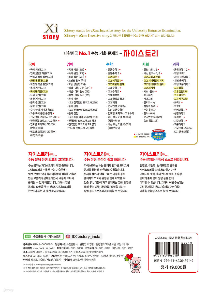· 최신 12개년 고2 학력평가 문학 기출문제 수록 · 2028학년도 수능 예시문항 수록 · 작품 갈래별 독해 공식 훈련과 문제 풀이 특강 · 1등급 대비 문제 - 단서 + 발상 , 왜 틀렸나 단계별 해설 · 한눈에 보이는 입체 첨삭 해설 · 작품 분석 - 이것이 핵심, 인물 관계도 · 어휘 + 개념어 테스트, 어휘 + 개념어 총정 〈자이스토리 수능 국어 문학 완성으로 수능 자신감 UP!〉 · 갈래별 6개 ‘독해 공식’ & 대표 유형 ‘문제 풀이 특강’ 갈래별 6개 ‘독해 공식’과 대표 문제 유형에 대한 ‘문제 풀이 특강’을 통해 쉽고 빠르게 수능 국어 문학을 완성할 수 있습니다. · 내신 대비 기출문제, 학력평가+수능 대비 기출문제 교과서와 연계된 지문을 분석하여 내신과 수능을 모두 대비할 수 있도록 하였습니다. 또한 지문별 제한 시간을 통해 실전 감각을 기를 수 있습니다. · 더욱 강화된 문학 어휘·개념어 문제편에 모든 지문과 문제의 필수 어휘·개념어를 모아 제시한 ‘어휘+개념어 총정리’, 각 단원이 끝난 후에 수록한 ‘어휘+개념어 TEST’를 통해 문학 어휘력을 강화할 수 있습니다. |