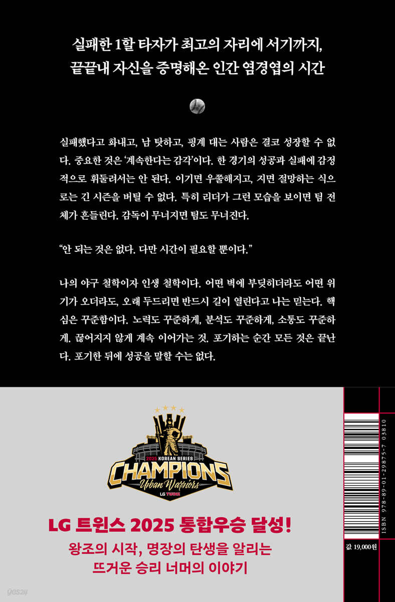 “생각이 인생을 바꾼다” 실패한 타자에서 최고의 자리까지, 자신을 증명해온 치열한 시간들 그는 자칭 ‘엉터리 선수’였다. 절실하게 노력한 적도, 인생에 목표도 없었다. 재능을 인정받으며 프로에 지명되고 주전 자리를 차지했지만, 작은 성공에 취해 야구는 뒷전이었다. 전성기는 짧았다. 점차 주전에서 밀려나 대수비 요원으로 뛰게 되었고 통산 타율 1할대의 초라한 기록을 남긴 채 10년 만에 유니폼을 벗어야 했다. 바닥에 떨어지고서야 그는 생각을 고쳐먹었다. 야구 공부를 처음부터 다시 시작했다. 벤치 신세였지만 오히려 감독의 시선으로 경기를 지켜보며 모든 플레이를 기록하고 밤새 분석했다. 야구 관련 책은 모조리 구해서 읽었다. 코치 자리를 얻지 못해 프런트 직원으로 입사한 후 ‘작은 일을 하더라도 염경엽이 하면 다르다’는 소리를 듣겠다는 목표로 죽기 살기로 일했고, 그러는 동안에도 잠자는 시간을 쪼개 꾸준히 야구 매뉴얼을 만들었다. 지독한 노력과 공부를 통해 제2의 야구 인생을 쌓아 올렸다. 그렇게 만든 자기만의 특별함이 그를 코치로, 단장으로, 그리고 감독으로 이끌었다. 지도자로서 염경엽은 항상 트렌드를 앞서가는 야구를 선보이며 KBO의 판도를 흔들었고, 만년 하위 팀이던 넥센을 4년 연속 가을야구에 진출시키며 세상을 놀라게 했다. 치밀한 데이터 분석을 바탕으로 전략적인 경기 운영을 선보이며 ‘염갈량’이라는 별명을 얻었다. 물론 좋은 날만 이어진 것은 아니다. SK 감독 시절 무거운 책임감에 스스로를 몰아붙이다 더그아웃에서 쓰러질 정도로 건강을 해쳤고, 결국 자진 사퇴를 해야 했다. LG 트윈스 암흑기 속에서 오명을 쓰고 팀을 떠난 과거도 있다. 그때마다 그는 스스로를 바닥부터 돌아보고 다시금 일신했다. “나는 더 이상 완벽을 추구하지 않는다. 모든 과정을 통제하려는 집착은 결국 나를 무너뜨렸고 뼈아픈 실패로 내몰았지만, 그것은 끝이 아니라 방향을 바꾸라는 신호였다. 나는 여전히 최선을 다할 것이다. 하지만 그 결과가 뜻대로 되지 않더라도 이제는 받아들일 수 있다. 중요한 건 그 안에서 나를 잃지 않는 일, 그리고 다시 일어설 수 있는 힘을 남겨두는 일이다.” -「결과와 과정은 결국 하나다」에서 LG 트윈스 최초 두 번의 통합우승 달성한 명장의 탄생! 디테일의 승부사 ‘염갈량’, 끝까지 믿고 키워내는 ‘염버지’의 리더십 철학 2023년 그는 감독이 되어 ‘우승 청부사’로서 LG 트윈스에 돌아왔고, 29년 만의 통합우승을 이끌며 숙원을 풀었다. 그리고 2년 만인 2025년 다시 통합우승을 달성하며 새로운 왕조의 서막을 열고 있다. 길었던 ‘비밀번호’를 청산하고 가을야구 단골손님이 되었지만 충분한 전력을 갖추고도 번번이 문턱에서 좌절했던 LG 트윈스를 우승으로 이끈 힘은 무엇이었을까? ‘역대 LG 감독 최초 두 번의 통합우승 달성’이라는 기록 뒤에는 염경엽 감독만의 특별한 리더십이 자리하고 있다. 지략의 승부사로서 ‘염갈량’로 불리는 동시에 세심한 육성과 커뮤니케이션으로 ‘염버지’라고도 불리는 염경엽 감독. 기록광으로도 유명한 그는 오랫동안 공부하고 경험한 내용을 ‘야구 매뉴얼’과 ‘리더십 노트’로 정리해왔고, 그 속에 담긴 일과 인생, 야구에 관한 철학이 한 권의에 담겼다. 프로 선수 출신으로 프런트 운영팀장과 스카우터, 코치와 감독, 단장까지 두루 거친 남다른 커리어는 그에게 폭넓은 경험과 균형 잡힌 시야를 갖게 해주었다. 또 제2의 야구 인생을 ‘지독한 공부’를 통해 쌓아 올린 만큼 항상 새로운 전략과 도전을 선보이면서 KBO의 트렌드를 선도해왔다. 그러면서도 성공의 본질을 ‘사람’에서 찾은 그는 ‘함께하는 성공’과 ‘사람으로 이어지는 시스템’을 일구기 위한 다각도의 노력을 야구라는 삶 속에서 펼쳐 보이고 있다. 내부 경쟁보다 정확한 역할 부여에 방점’ 나는 선수들에게 1년을 보장해준다. 웬만해서는 시즌 중에 주전과 비주전을 바꾸지 않는다. 라인업을 개막 직전까지 비밀에 부치고 경쟁을 유도하는 팀도 있지만, 나는 스프링캠프에서부터 선수들에게 각자의 역할을 통보해준다. 주전은 주전답게, 백업은 백업답게 시즌을 준비해달라는 뜻이다. 경쟁보다 준비가 더 중요하기 때문이다. 선수들의 역할을 정확하고 디테일하게 정해주고 면담을 통해 이해시킨다. 그리고 선수들은 각자 맡은 역할을 100퍼센트 수행할 수 있도록 훈련하고 연습한다. (…) 내 경험상 선수들은 자리가 보장될 때 오히려 더 안정감을 느끼고 자신의 역량을 발휘하는 경우가 많았다. 불안하게 경쟁에 시달리는 것보다, 자신의 역할에 집중할 때 더 좋은 성과를 낼 수 있었다. -「경쟁시키지 않는다」에서 두려움 없는 조직을 만든 ‘달리는 야구’ ‘달리는 야구’는 단순한 전술적 변화가 아니었다. 그것은 팀 전체의 정신을 바꿔놓는 작업이었다. 누상에 주자가 끊임없이 움직이자 타자들은 더 집중했다. 득점 루트도 다양해졌다. 홈런이 없는 경기에서도 발로 점수를 만들어낼 수 있었다. 무엇보다, 달리는 야구는 우리 팀에 하나의 메시지를 심어주었다. “실패를 두려워하지 말고 도전하라.” (…) 2023년,