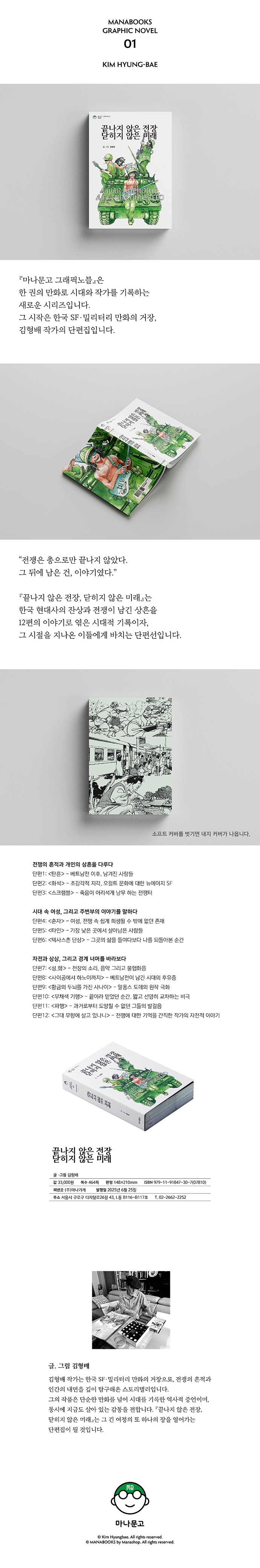 단편1: 〈탄흔〉 - 베트남전 이후, 남겨진 사람들 단편2: 〈화석〉 - 초감각적 지각, 오컬트 문화에 대한 뉴에이지 SF 단편3: 〈스크램블〉 - 죽음이 어리석게 남무 하는 전쟁터 시대 속 여성, 그리고 주변부의 이야기를 말하다 단편4: 〈춘자〉 - 여성, 전쟁 속 쉽게 희생될 수 밖에 없던 존재 단편5: 〈타인〉 - 가장 낮은 곳에서 살아남은 사람들 단편6: 〈텍사스촌 단상〉 - 그곳의 삶을 들여다보다 나를 되돌아본 순간 자전과 상상, 그리고 경계 너머를 바라보다 단편7: 〈성,聲〉 - 전장의 소리, 음악 그리고 불협화음 단편8: 〈사이공에서 하노이까지〉 - 베트남전이 남긴 시대의 후유증 단편9: 〈황금의 두뇌를 가진 사나이〉 - 알퐁스 도데의 원작 극화 단편10: 〈무채색 기행〉 - 끝이라 믿었던 순간. 짧고 선명히 교차하는 비극 단편11: 〈파행〉 - 과거로부터 도망칠 수 없던 그들의 발걸음 단편12: 〈그대 무향에 살고 있나니〉 - 전쟁에 대한 기억을 간직한 작가의 자전적 이야기 |