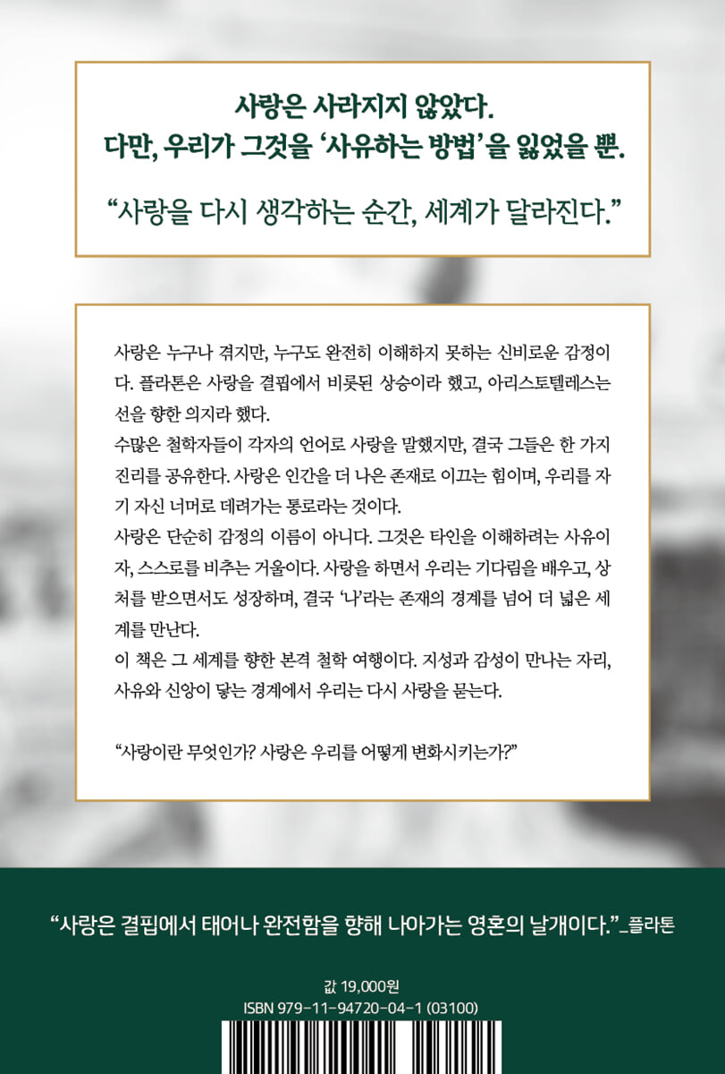 1장 불안의 시대, 입 속 모래 같은 사랑 _사랑을 잃어버린 세계 사랑을 이유 삼아 스스로를 괴롭히는 사람들 가성비를 따지기 시작한 연애와 결혼 ‘당신이 필요하다’라는 말의 의미 왜 사랑을 낚으려 하는가 이것 때문에 사랑을 잃어버렸다 ㆍ철학자들의 사랑 수업 1 2장 감정이 아닌 사유로서의 사랑 _사랑이란 무엇인가 ‘사랑해’와 ‘좋아해’는 어떻게 다를까? 불안한 시대, 사랑도 불안하다 ‘순도 높은 사랑’이란 무엇일까 본질은 받는 게 아니라 주는 데 있다 자기혐오는 땅굴만 파게 할 뿐 서서히 달라지고 깊어진다 예수가 진정으로 원했던 사랑이란 부처가 살아 있는 건 행복하라고 말했던 이유 ㆍ철학자들의 사랑 수업 2 3장 타자와 관계 맺고 세계와 연결되어야 하는 이유 _왜 지금 사랑이 필요할까 진정한 경험으로 진짜 나를 되찾는다 해치워야 하는 하루가 아닌, 몰입하는 하루를 위해 삶의 본질을 경험한다 불안한 세상을 넓은 시야로 바라보게 한다 사람을 구별하는 힘이 생긴다 내가 어떤 상태인지 판단할 수 있다 거짓 없는 인생을 살기 위하여 ㆍ철학자들의 사랑 수업 3 4장 잃어버린 오래된 감각을 찾아서 _인간을 이해하기 위한 철학 행복한 왕자는 왜 행복했을까? 행복에 꼭 필요한 건 이것이었다 정신의 기쁨과 육체의 기쁨을 되찾는 일 진짜 사랑과 가짜 사랑을 구별하는 법 사랑은 우리를 어떻게 변화시키는가 사랑하는 사람의 전부를 알려 하지 않는다 자기 중심에서 상대 중심으로 누구에게도 휘둘리지 않는 세계 ㆍ철학자들의 사랑 수업 4 5장 사랑, 사람 그리고 삶을 이해하는 법 _사랑을 다시 되찾는 길 있는 그대로 사랑하라 상대에게 순수하게 몰입하라 서로에게 스며들라 내가 사랑하면 상대도 응답한다 ㆍ철학자들의 사랑 수업 5 6장 사랑이라는 세계로 돌아가는 연습 _모두를 위한 행복한 삶 누군가를 위한 홀로서기 연습 나 자신에게 중심을 맞춰라 사랑은 생각보다 용기가 필요하지 않다 계산하지 않고 마음을 준다 고독 속에서 타인을 받아들이는 법 ㆍ철학자들의 사랑 수업 6 나가는 글 _사랑을 기다리는 이에게 |