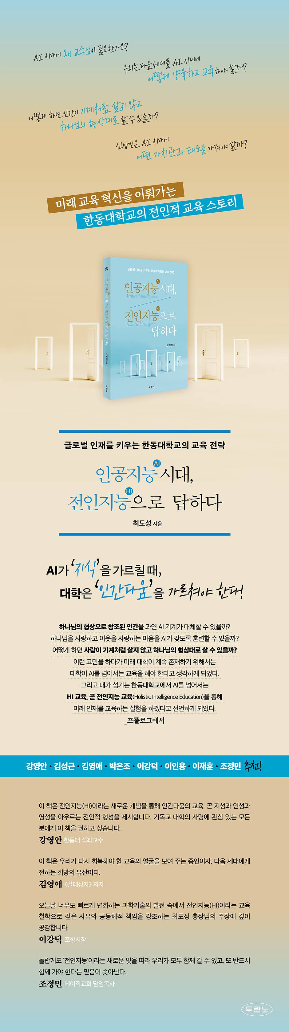 이 책은 아직 완성되지 않았다. 아마도 한동안 진행형일 것이다. 왜냐하면 AI가 어떻게 변화할지 모르기 때문이다. 그러나 한 가지 확실한 것은 AI가 절대로 넘볼 수 없는 인간의 지능, 하나님의 형상을 가진 인간만이 가지는 지능이 있다는 사실이다. 이 지능으로 AI를 동반자 삼아 새로운 미래를 열어 가야 하지 않을까 생각해 본다. --- p.16 「프롤로그」 중에서 기술은 상상을 초월할 만큼 빠르게 발전하고 있으며 우리의 일상은 이미 다양한 혁신 기술에 둘러싸여 있다. 그러나 교육은 여전히 속도를 따라가지 못하고 있다. 흔히 회자되는 말처럼 ‘19세기 학교에서 20세기 교수가 21세기 학생을 가르친다.’ 이는 단순한 풍자가 아니라 오늘날 교육의 정체된 현실을 날카롭게 드러낸다. 낡은 교실에서 정해진 지식을 암기하고 시험을 통과하는 방식으로는 미래 사회의 문제를 해결할 수 없는 것이다. --- p.31 한동대학교는 변화하는 시대의 도전에 응답하고자 기독교적 가치를 뿌리로 삼은 전인지능(HI: Holistic Intelligence) 교육 모델을 중심에 두고 고등교육의 새로운 방향을 제시했다. HI 모델은 지식 습득을 넘어 인간의 전인적 성장을 목표로 한다. ‘지성’, ‘인성’, ‘영성’이라는 세 축을 통합해 인간을 전체적 존재로 바라보는 교육철학을 실천하고 있으며, 특히 기술과 정보가 중심이 된 오늘날의 교육 환경 속에서 깊은 사유와 공동체적 책임을 강조하는 대안적 교육 접근으로 주목받고 있다. 이 철학은 구체적인 교과와 프로젝트에 녹아 있다. --- p.53 지식이 곧 권력이던 시대는 지났다. 이제는 지식을 어떻게 해석하고, 누구와 연결하며, 무엇을 위해 사용할 것인지가 중요하다. 이때 교육은 일방적인 전달이 아닌 만남과 변화의 장이 된다. 그리고 이 교육은 학생뿐 아니라 교사와 제도 모두를 향해 자신을 되묻게 만든다. 결국 미래 교육의 핵심은 ‘정답’을 아는 사람이 아니라 ‘더 나은 질문’을 던지는 사람, 질문 속에서 함께 성장할 수 있는 사람을 길러 내는 데 있다. 이러한 교육철학은 이미 세계 곳곳에서 실험되고 있다. 대표적인 사례 중 하나가 바로 벤 넬슨(Ben Nelson)이 주도한 미네르바 프로젝트다. --- p.94 예측할 수 없는 세상에서 가장 필요한 역량은 변화에 능동적으로 대응하는 힘, 타인과 협력하며 공동의 해법을 찾아내는 능력, 그리고 자기만의 목소리로 세계와 소통할 수 있는 감각이다. 그래서 진짜 교육은 지식을 주입하는 일이 아니라 가능성을 깨우고 확장하는 일이다. 미네르바 수업을 들었던 한 학생에게 이렇게 물었다. “그 수업, 졸업 후에도 기억에 남을 것 같나요?” 학생은 망설임 없이 고개를 끄덕였다. “살면서 가장 많이 말하고, 가장 많이 듣고, 가장 많이 생각한 수업이었어요.” --- p.114 네 번째 단계는 학습의 재구성, 곧 ‘나의 배움이 누군가의 배움으로 이어지도록 기록하고 공유하는 과정’이다. 현장에서의 실천과 경험은 학문적 언어로 다시 정리되며 학생들은 프로젝트의 전 과정을 논문, 보고서, 발표 등의 형태로 구체화해 나간다. 교수는 피드백을 통해 사고의 방향을 잡아 주고 학생은 이를 반영하며 논리적 설득력과 표현력을 갖춘 결과물로 완성해 간다. 이 자료는 다음 세대 학생들에게는 생생한 참고 자료가, AI 시스템에는 데이터 기반 향상 학습의 자원이 된다. --- p.135 이제 우리는 교육을 ‘전달의 기술’이 아닌 ‘변화의 생태계’로 보아야 한다. 빠르게 변화하는 시대 속에서 살아 있는 교육이 되기 위해서는 배움이 행동으로 이어지고 행동이 다시 공동체 안에서 공유되며 순환하는 구조가 필요하다. 한동대학교가 추구하는 HTHT 모델은 바로 순환의 고리를 실험하고 확장하는 모형이다. 결국 교육의 진짜 혁신은 새로운 콘텐츠도 첨단 기술도 아닌, 학생의 내면에서 일어나는 변화에 대한 끊임없는 신뢰와 기다림으로부터 시작된다. 배움의 끝은 지식이 아니다. 그것은 세상을 바꾸는 ‘사람’이다. --- p.136 HI 교육의 바탕은 도덕지능(Moral Intelligence)의 함양이다. 도덕지능은 IQ(지능지수)나 EQ(감성지수)와 달리 옳고 그름에 대한 분별력, 자기 행동에 대한 책임감, 그리고 타인을 향한 존중과 배려의 능력을 중심에 둔다. 정직성은 남을 속이지 않는 것을 넘어서 자신에게도 정직한 태도를 뜻한다. 인테그리티는 말과 행동이 일치하는 일관성을 의미하며, 외적인 윤리와 내적인 신념이 조화를 이루는 삶을 지향한다. --- p.157 한동대학교에서 20여 년간 꾸준히 운영해 온 또 다른 대표적인 프로그램이 있다. GEM(Global Engagement and Mobilization)은 교수와 학생이 한 팀을 이루어 ‘적정기술(Appropriate Technology)’을 기반으로 개발도상국의 낙후 지역에서 실질적인 삶의 질 개선 활동을 실천하는 프로그램이다. 이 프로젝트는 실제 사회 문제를 기술과 지식을 통해 해결해 보는 교육의 실천이자 ‘공부해서 남 주자’라는 철학이 생활기술 영역으로 확장된 예시다. --- p.202 아무리 좋은 생각도 전달되지 않으면 의미가 있을 수 없다. 따라서 말과 글, 프레젠테이션을 통해 자신의 논리를 설득력 있게 펼치는 능력을 반드시 훈련해야 한다. 나의 경험상 우리나라 대학생들이 특히 
