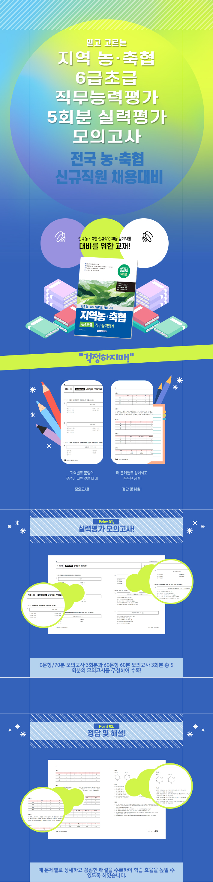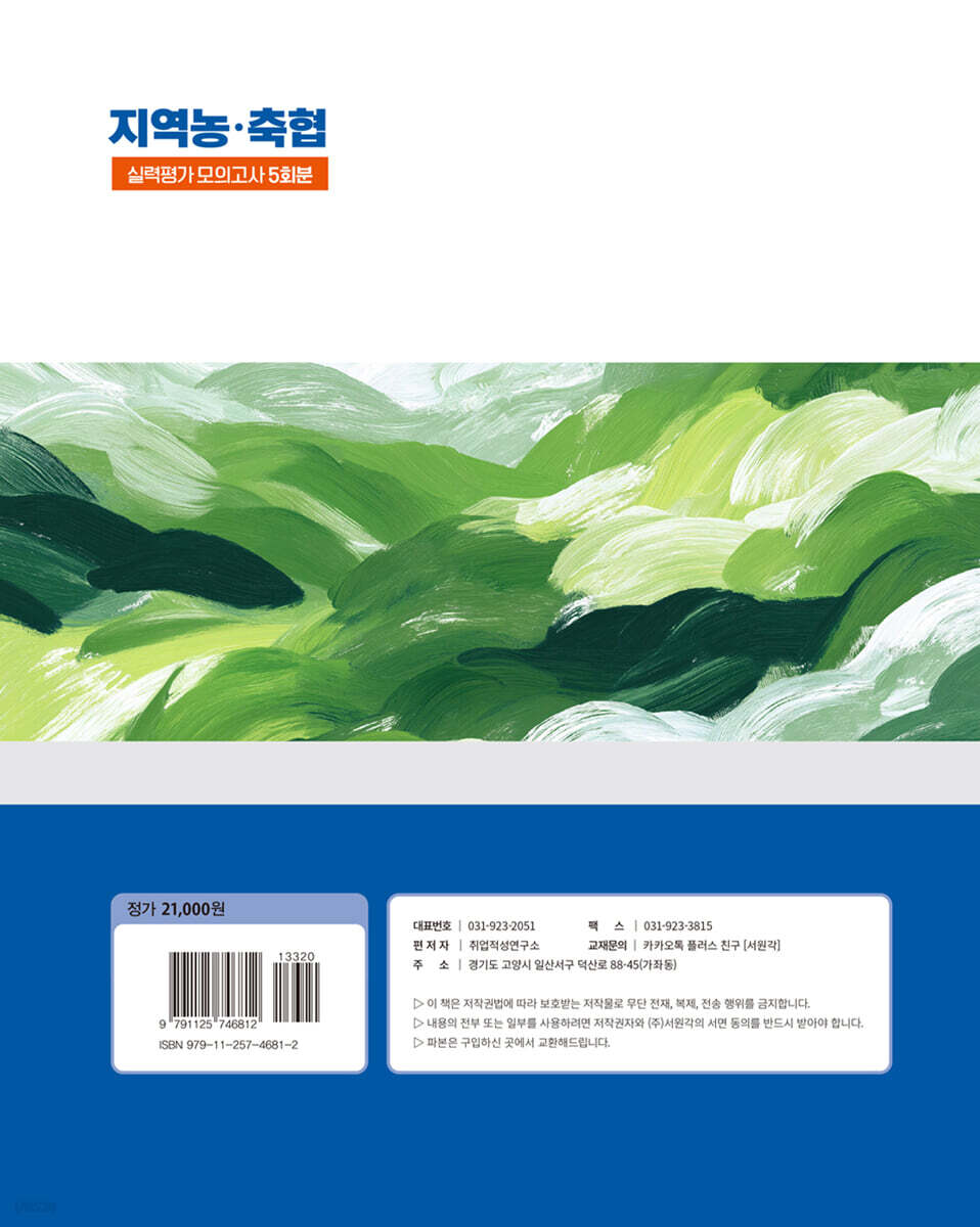 경기·강원·충북·충남세종·전북·전남·경북·경남·서울·인천·제주·부산 지역 농·축협 대비! 1. 농협 소개 및 농협 10대 이슈를 수록하여 농협 상식을 준비할 수 있도록 구성하였습니다. 2. 지역별로 문항의 구성이 다른 것을 대비하기 위해서, 70문항/70분 모의고사 3회분과 60문항 60분 모의고사 3회분 총 5회분의 모의고사를 구성하여 수록하였습니다. 3. 매 문제별로 상세하고 꼼꼼한 해설을 수록하여 학습 효율을 높일 수 있도록 하였습니다. 4. 시간에 맞춰서 OMR 답안지도 체크해볼 수 있도록 5회분 OMR 답안지를 수록하였습니다. |