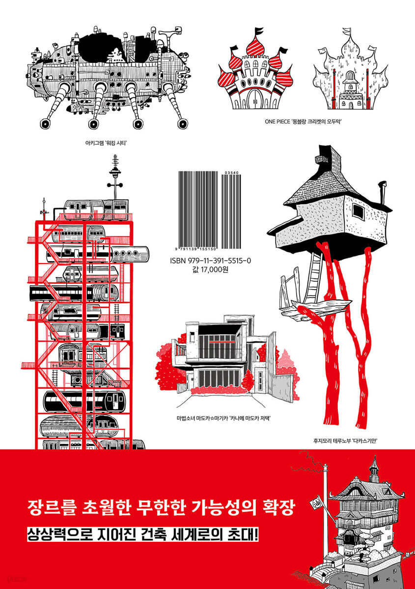 건축 디자인의 대혁명! 모던하고 멋진 근대 건축 5원칙 ‘멋진 건축’의 정체 건축에 자유를! 근대 건축 5원칙의 태동을 이끈 돔-이노 시스템 근대 건축은 여기서 시작되었다 지상과 옥상에 새로운 공간을 No. 002 닌텐도 슈퍼 마리오 시리즈 지붕은 자유다! 쿠파성에서 장난기 가득한 발상을 보다 머리 위에 ‘기호’를 얹다 일본 전통 지붕을 얹은 실제 건축물 지붕에 매료되는 건축물 No. 003 HUNTER×HUNTER 대체 어떻게 짓는 것일까? 독특한 역사와 아름다움을 지닌 타워 건축 최첨단 기술의 집약체, 타워 건축 바람을 제압하는 자가 하늘을 지배한다! ‘빠르고, 멋지고, 안전한’ 커튼월 타워는 무엇으로 만들까? 타워 건축 디자인의 역사 No. 004 레디 플레이어 원 일본이 탄생시킨 놀라운 기법! 생물처럼 형태를 바꾸는 건축물 메타볼리즘 건축이란? ‘이게 된다고?’ 재조합 가능한 캡슐 건축 탄탄한 근육질 구조체에 객실을 매단 호텔 현대적으로 해석된 새로운 메타볼리즘 No. 005 드래곤볼 마인 부우는 천재 건축가?! 꿈이 펼쳐지는 셸 구조 건축의 가능성을 확장하다 마인 부우의 집과 셸 구조 건축물 최신 셸 구조 기술 No. 006 센과 치히로의 행방불명 유바바의 디자인 감각! 유야 온천장에서 배우는 ‘비움’의 기술 건축의 개방감 체험을 디자인하는 보이드 건물을 관통하는 보이드 리노베이션과 보이드 No. 007 주술회전 건축사에 남을 큰 논쟁을 일으킨 작품! 주술 고등전문학교는 일본 전통 양식일까? 전통 논쟁과 세계적 건축가 단게 겐조 주술 고등전문학교, 야요이 건축의 재해석인가? 조몬과 야요이의 결합 일본 건축을 세계에 알린 전설, 단게 겐조 No. 008 ONE PIECE 많은 팬을 매료시킨 귀여움! 사랑스러운 ‘허세 건축’ 상인의 지혜에서 탄생한 건축 양식 사랑스러운 건축물은 이렇게 탄생했다! 간판 건축은 민중의 캔버스다! 현대의 간판 건축은 도로변에 있다? No. 009 신세기 에반게리온 NERV는 최강 요새였을까? 역사의 뒤편에서 탄생한 요새 건축의 세계 요새 건축은 실재했다! 도시 전체로 지켜라! 거대한 스케일의 요새 도시 방어에 전력을 다하다! 생활은 불편한 요새 건축 No. 010 게게게의 기타로 집은 주거 목적만이 아니다! 건축이 지닌 또 다른 가치란? 건축이 가진 또 하나의 의미 게게게 하우스는 실재했을까? 단순한 인용이 아닌, 샘플링 건축 No. 011 극장판 짱구는 못말려: 핸더랜드의 대모험 뾰족하게! 돋보이게! 화려하게 개성을 뽐내는 건축물 새로운 가치관을 창조한 신진 건축가들 질서를 파괴하라! 다다이즘 건축 심플하면 지루할까? 궁극의 ‘그럴듯함’ 테마파크 건축 No. 012 하울의 움직이는 성 도시가 걸어 다닌다?! ‘짓지 않는’ 건축의 세계 건축의 해체 신기하고 희한한 워킹 시티 모든 것을 집어삼키는 미술관 No. 013 찰리와 초콜릿 공장 비밀의 초콜릿 공장에는 최첨단 건축 기술이 집약되어 있었다! 건축 양식의 쇼룸 찰리의 집은 탈구축주의 움파룸파와 바이오미미크리 최첨단 과자 발명의 산실, 하이테크 건축 |