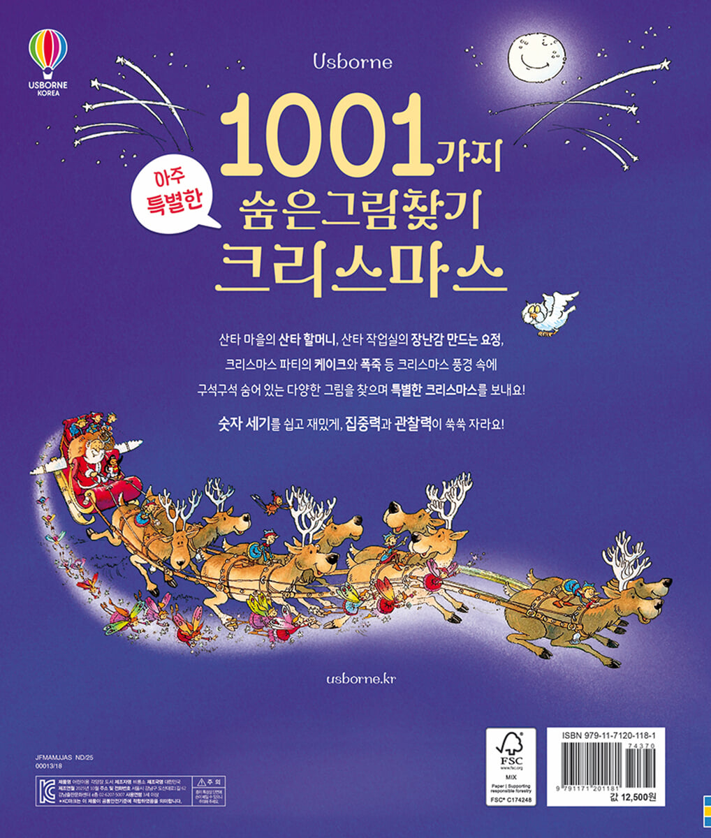 13가지 크리스마스 풍경은 각기 다른 즐거움을 담고 있어요. 한겨울 산타 마을의 산타 할아버지와 할머니, 다양한 요정들과 풍경에 어울리는 사물들은 생김새와 특징이 무척 다양하답니다. 각 장면에서 산타 할아버지와 할머니는 물론, 편지의 요정, 썰매를 탄 요정, 눈사람 요정, 장난감을 만드는 요정, 땅의 요정, 선물 요정 등 작고 귀여운 요정들을 만날 수 있어요. 또 곰 인형, 장난감 자동차, 크리스마스 케이크, 선물 상자, 크리스마스 양말, 지팡이 사탕 등 크리스마스 하면 떠오르는 사물들이 곳곳에 숨어 있지요. 요정과 사물들의 각기 다른 생김새와 특징을 살펴보는 재미를 느끼며 다가오는 크리스마스를 기대해 보세요. 특별한 크리스마스를 보내게 될 거예요! 놀이로 자연스럽게 ‘숫자 세기’를 익혀요! 널찍한 두 페이지에 걸쳐 큼직하게 그려진 그림이 아이들의 시선을 사로잡고 숨은그림찾기의 즐거움을 한껏 높여 줄 거예요. 유아의 눈높이에 맞춰 각 그림을 1개에서 10개까지 찾도록 구성되었어요. 숫자는 큼지막하게 쓰여 있어 숫자를 인지하며 숨은그림찾기를 즐길 수 있지요. 그 과정에서 자연스럽게 1부터 10까지 세는 방법을 익히게 되고, 그림을 모두 찾아낸 다음에는 성취감을 얻게 될 거예요. 장면마다 산타 할아버지와 할머니, 요정, 사물들이 알록달록하고 세밀하게 가득 채워져 있어 그림을 보는 것만으로도 재미있고 흥미롭답니다. |