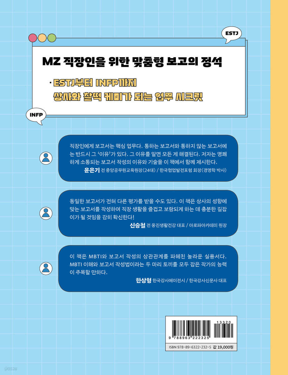 이 책은 MBTI와 보고서 작성의 상관관계를 파헤친 놀라운 실용서다. MBTI 이해와 보고서 작성법이라는 두 마리 토끼를 모두 잡은 작가의 능력이 주목할 만하다. - 한상형 (한국강사에이전시, 한국강사신문사 대표 )