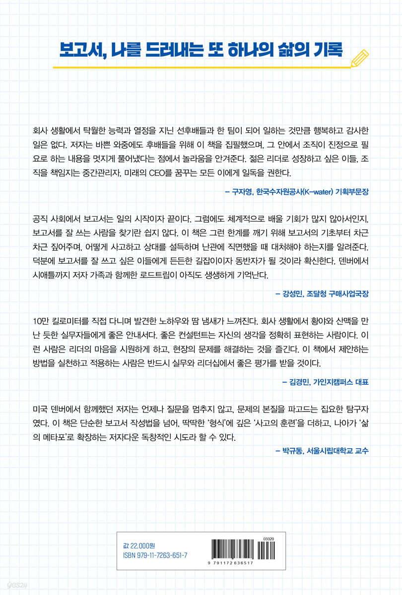 공직 사회에서 보고서는 일의 시작이자 끝이다. 그럼에도 체계적으로 배울 기회가 많지 않아서인지, 보고서를 잘 쓰는 사람을 찾기란 쉽지 않다. 이 책은 그런 한계를 깨기 위해 보고서의 기초부터 차근차근 짚어주며, 어떻게 사고하고 상대를 설득하며 난관에 직면했을 때 대처해야 하는지를 알려준다. 덕분에 보고서를 잘 쓰고 싶은 이들에게 든든한 길잡이이자 동반자가 될 것이라 확신한다. 덴버에서 시애틀까지 저자 가족과 함께한 로드트립이 아직도 생생하게 기억난다. - 강성민 (조달청 구매사업국장)