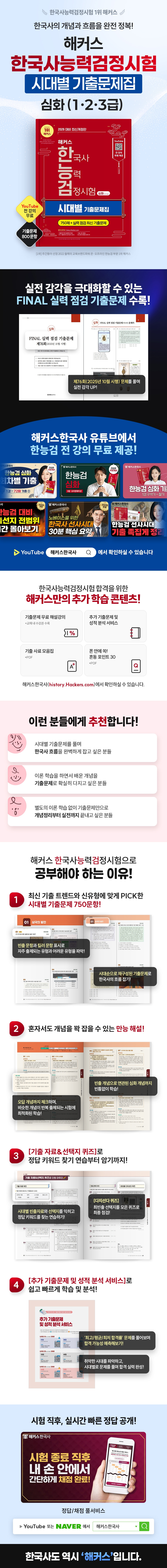 주간동아 선정 2022 올해의 교육 브랜드 파워 온·오프라인 한국사능력검정시험 부문 1위 최신 기출 트렌드에 맞는 기출문제 800문항 PICK! 한국사의 개념과 흐름을 완전 정복하는 시대별 기출문제집 [이런 분들에게 추천합니다] 1. 시대별 기출문제를 풀며 한국사 흐름을 완벽하게 잡고 싶은 분들 2. 이론 학습을 하면서 배운 개념을 기출문제로 확실히 다지고 싶은 분들 3. 별도의 이론 학습 없이 기출문제만으로 개념정리부터 실전까지 끝내고 싶은 분들 1. 최신 기출 트렌드와 신유형에 맞게 PICK한 시대별 기출문제 750문항! 1) 최근 7개년(76회~42회) 기출문제 중 최신 기출 트렌드에 따라 합격에 필요한 총 750개의 문제를 골랐어요. 2) 엄선한 기출문제를 시대순으로 재구성하여, 문제를 풀며 자연스럽게 한국사의 흐름을 잡을 수 있어요! 3) 시대 통합형 기출문제는 ‘통합 주제’로 구성하여, 신유형까지 철저히 대비할 수 있어요. 4) 빈출 문항과 킬러 문항을 표시해 두어, 시대별로 자주 출제되는 유형과 어려운 유형을 함께 파악할 수 있답니다! 2. 혼자서도 개념을 꽉 잡을 수 있는 만능 해설! 1) 정답의 근거가 되는 핵심 키워드를 확인한 뒤, 쉽게 풀어 쓴 설명을 읽으며 스스로 개념 정리를 할 수 있어요! 2) 정답 개념뿐만 아니라 오답 개념까지 꼼꼼하게 짚어주어, 비슷한 개념이 반복 출제되는 시험에 최적화된 학습을 할 수 있어요. 3) 해설 아래에 정리된 빈출 개념으로 문제와 연관된 심화 개념까지 빈틈없이 꽉 채워 학습하세요! 3. [기출 자료&선택지 퀴즈]로 정답 키워드 찾기 연습부터 암기까지! 1) 문제를 풀고 해설까지 학습한 후, ‘기출 자료&선택지 퀴즈’를 풀며 시대별 빈출 자료와 선택지를 익히고 정답 키워드를 찾는 연습을 할 수 있어요. 2) 최빈출 선택지를 모아 구성한 ‘다지선다 퀴즈’로 암기한 내용을 최종 점검하며 마무리할 수 있습니다! 4. [FINAL 실력 점검 기출문제], 실제 시험지 형태의 기출문제로 실전 감각 극대화! 가장 최신 회차인 한국사능력검정시험 제76회(2025년 10월 시행)의 문제를 실제 시험지 형태로 만들었어요. 최신 회차를 풀며 실전 감각까지 극대화할 수 있답니다! 5. QR코드를 통해 모바일로 쉽고 편하게! [추가 기출문제 및 성적 분석 서비스] 1) 최근 시험 중 '최고/평균/최저 합격률'의 6회분을 풀어보며, 자신의 합격 가능성을 예측해볼 수 있어요. 모바일로 교재에 수록된 QR코드만 찍으면 쉽고 편하게 문제를 풀고 해설을 공부할 수 있답니다! 2) QR 코드를 통해 문제풀이한 모든 회차의 점수를 종합하여 성적 분석을 해준답니다! 취약한 시대를 정확하게 알려주고, 시대별로도 문제를 모아 풀 수 있어 합격 실력을 완성할 수 있어요! [한국사능력검정시험 합격을 위한 해커스만의 추가 학습 콘텐츠 - 해커스한국사(history.Hackers.com)] 1. 기출문제 무료 해설강의(교재 내 수강권 수록) 2. 추가 기출문제 및 성적 분석 서비스 3. 기출 사료 모음집(PDF) 4. 폰 안에 쏙! 혼동 포인트 30(PDF) |