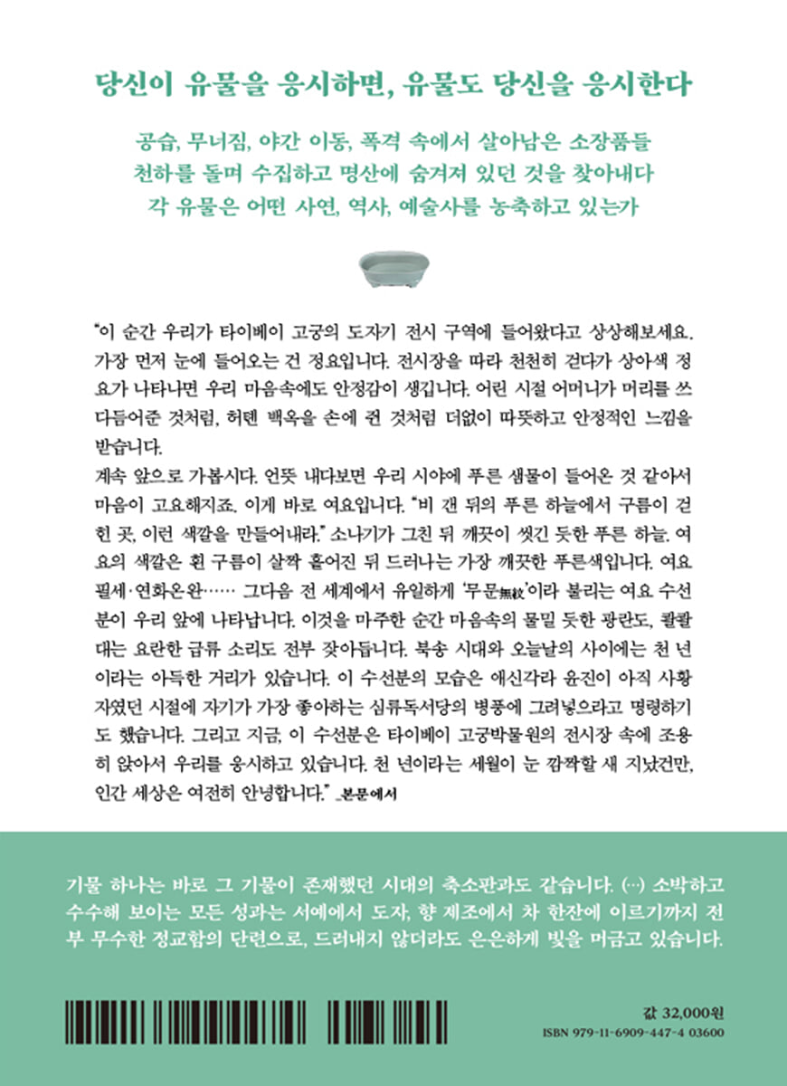 저는 그 이야기를 들으면서 정신을 차리지 못할 정도로 매혹되었고, 신나서 어쩔 줄 몰랐습니다 _뤄이쥔 머리말 저는 타이베이 고궁의 가장 빛나는 보물을 당신의 다보격에 넣고 싶습니다 1. 여요 청자무문수선분 | 내 마음속의 언제나 화창한 하늘 2. 한식첩 | 천고 문인 중 으뜸은 소동파 3. 한대의 옥무인 | 섬섬옥수 위에서 사뿐사뿐 춤추네 4. 계산행려도 | 하늘과 땅 사이에서 사람의 위치를 찾다 5. 회도가채사녀용 | 고궁의 제일가는 미인 6. 정요 왜왜자침 | 눈처럼 하얗게 빛나는 7. 건요 | 어둠의 미학 8. 남송 관요 | 나의 아름다움과 애수 9. 송인서방 | 자기만의 방 10. 모공정 | 나라를 지키는 보물 11. 당인궁락도 | 봉래궁에 뜬 일월은 영원하리 12. 명황행촉도 | 꿈인가! 생시인가! 13. 제질문고 | 세상에 남은 안진경체 중 으뜸 14. 다보격 | 황제의 장난감 상자 15. 투채계항배 | 청화에서 투채까지 16. 강희 법랑채 자기 | 청나라 궁정의 으뜸 17. 옹정 법랑채 자기 | 시·서·화·인, 금성과 욱영 18. 건륭 법랑채 자기 | 화려한 경치들 19. 남훈전도상 | 인증숏을 봅시다 20. 조춘도 | 수려하면서도 아리땁다 21. 화랑도 | 백 가지 물건을 짊어지고 골목을 누비니 22. 취옥백채 | 보석분경 23. 작화추색 | 시공을 뛰어넘은 사랑의 편지 24. 부춘산거도 | 영원한 산수 25. 용슬재도 | 사람 없는 정자가 예찬을 말하다 26. 격사 | 통경단위 27. 남송 산수 소품 | 유풍이 두루 미쳐 따스한 봄바람 속에 앉아있는 듯하구나 28. 계산청원」 | 마음을 닦고 도를 관조해야 눕거나 앉아서 그림을 보더라도 만 리를 노닐 수 있다 29. 청나라 궁정에 오랫동안 수장된 비연호 | 아주 좋은 완물 30. 한궁춘효 | 흐르는 쾌락송 31. 명대 칠기 | 꿈결을 쌓다 32. 명사대가 | 선물에서 상품까지, 그리고 당인 33. 문징명에서 문진형까지 | 소시대의 일상 34. 천향 가남 | 금처럼 단단하고 옥처럼 따스하구나 35. 구구임옥 | 환상으로 사실을 그린 왕몽 36. 쾌설시청첩 | 꿈속의 소나타 |