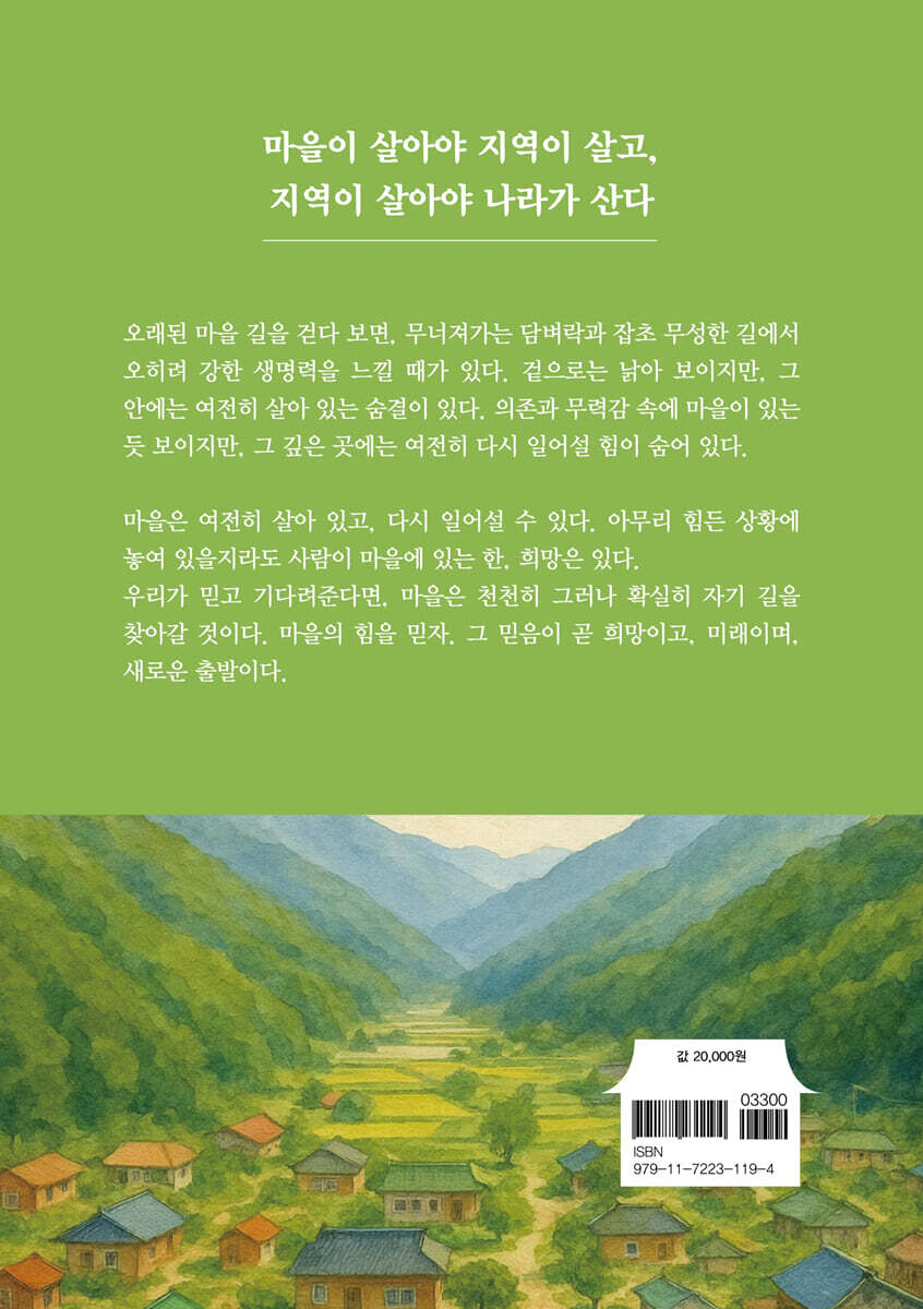책이 말하는 살고 싶은 마을은 단순히 잘 사는 것만을 의미하지 않는다. 주민이 주인이 되어 스스로 기획하고, 배우고, 협력하며, 나누는, 살아 꿈틀대는 마을이다. 즉, 삶의 질이 높아지고 행복감은 커지는 공동체이다. 책은 이런 공동체로서 마을 성장 모델을 네 단계, ‘생활공동체 → 학습공동체 → 경제공동체 → 나눔공동체’를 중심축으로 제시하고 있다. 이어서 각 단계가 어떻게 형성되어야 하고, 어떻게 주민의 마음을 움직여야 하는지를 실제 마을 사례와 대화, 전문가 해설이라는 형식을 통해 재미있게 풀어낸다. 각 사례와 주민과의 대화 등은 누구나 내 마을에서 겪거나 겪을 법한 일이다. 저자는 이런 실감 나는 사례를 바탕으로 오랜 현장 경험에서 나오는 안목과 통찰로 그 해법을 제시한다. “주민이 구경꾼인 마을사업은 결코 성공할 수 없다”, “배움이 있는 마을은 늙지 않는다” 등의 명쾌한 메시지는, 마을 복원을 외치면서도 우리가 놓치고 있는 것들과 오늘에 맞게 변화해야 할 것들을 짚어주며 독자에게 다가선다. 마을 공동체 복원이 곧 대한민국의 미래를 밝히는 일 오늘날 대한민국은 지방 소멸이라는 위기 앞에 섰다. 수많은 예산이 투입되고 다양한 정책이 쏟아지지만 위기는 요지부동이다. 우리의 마을은 각 지역, 나아가 나라의 풀뿌리와도 같다. ‘마을이 살아야 지역이 살고, 지역이 살아야 나라가 산다’는 명제가 성립하는 이유가 여기에 있다. 지방이 소멸하고 마을이 사라지는 위기 앞에서 세계 10위권의 경제대국은 허울에 불과하다. 우리의 전통마을이 되살아나고 활력을 찾으며, 이웃과 함께 하나의 공동체를 이룰 때 지방 소멸이라는 위기는 자연히 사그라지고 우리 미래는 더 밝아질 것이다. 마을 공동체 복원이 곧 대한민국의 미래를 밝히는 일인 셈이다. 이 책이 나온 이유도 여기에 있다. 무엇보다 책은 마을을 사업의 대상이 아닌 사람과 관계가 중심이 되는 살아 있는 공간으로 바라본다. 이는 마을을 넘어 우리가 꿈꾸고 바라는 사회는 어떤 모습이어야 할지 생각하며 더 큰 공동체를 꿈꾸게 한다. 경쟁과 이기로 모두가 불행해지기보다 함께함으로써 공동체를 이루고 모두가 행복한 마을, 그런 마을이 대한민국 사회 전체로 퍼져나가는 바람을 담아내고 있는 것이다. |