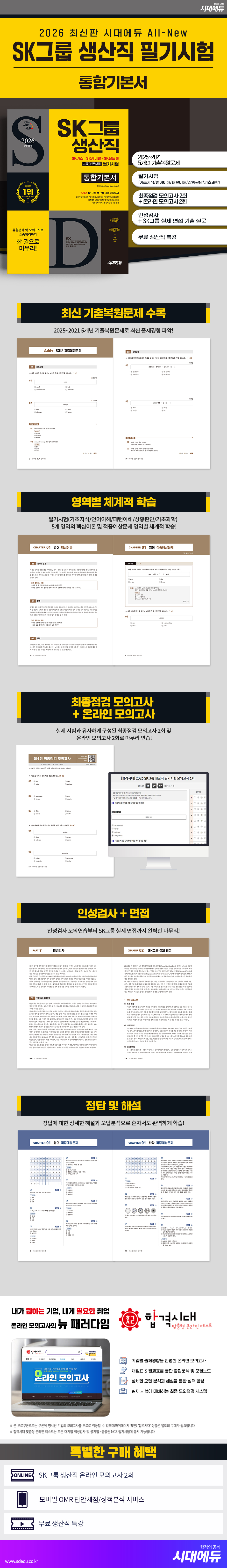 2025년~2021년 기출문제를 복원하여 5개년 기출복원문제를 수록하였다. 또한 기초지식, 언어이해, 패턴이해, 상황판단, 기초과학 총 5개 영역의 핵심이론 및 적중예상문제를 수록하였고, 최종점검 모의고사 2회분 및 온라인 모의고사 2회분을 통해 실제 시험처럼 연습할 수 있도록 하였으며, 인성검사 모의연습과 SK그룹 실제 면접 기출질문을 수록하여 SK그룹 생산직 채용의 최종 관문까지 대비할 수 있도록 하였다.