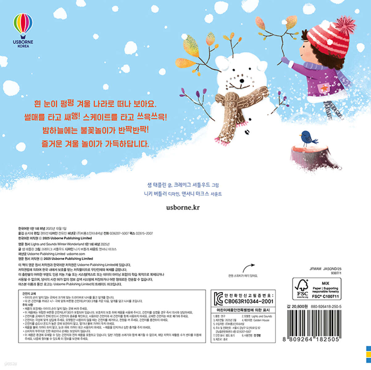 창밖에 흰 눈이 펑펑 내려요. 겨울 나라로 모험을 떠날 시간이에요! 아이들은 옷을 따뜻하게 입고 눈밭으 로 뛰어나가요. 눈을 뭉쳐 눈싸움도 하고, 동글동글 눈사람도 만들고, 눈썰매를 쌩쌩 타며 까르륵 웃지요. 신나게 놀다가 옹기종기 모여 노래를 부르면 아름다운 화음이 울려 퍼져요. 꽁꽁 언 얼음판에서 스케이트 를 타며 빙글빙글 돌기도 하고, 쓰윽쓰윽 미끄러져 나아가면 정말 재미있어요. 어느덧 캄캄한 밤이 되자 팡 팡 팡! 커다란 불꽃이 밤하늘을 환히 밝혀 준답니다. 아이들은 불꽃을 보며 한마음이 되어요. “우리는 겨울이 정말정말 좋아요!” 아이들의 눈과 귀를 사로잡는 불빛과 멜로디 버튼을 누르면 전구에 불이 켜지고 멜로디가 흘러나와요. 휘이잉! 바람 부는 소리, 쌔애애앵! 미끄러지는 눈썰매 소리, 트랄랄라 노랫소리, 쓰윽쓰윽! 스케이트 타는 소리, 팡 팡 팡! 불꽃놀이 소리 등 겨울 풍경을 담은 다양한 소리와 함께 불빛이 반짝거려요. 아름다운 겨울 나라에서 눈싸움, 눈썰매 타기, 스케이트 타기 등 재미있는 겨울 놀이를 즐기는 기분이 들 거예요. 소리와 빛이 겨울을 기다리는 설렘을 더해 주고, 오감 을 자극하는 책 읽기를 경험해 보세요. * 이 책을 펼치면 전구에 불이 켜져요. 5분이 지나면 자동으로 전원이 꺼지니, 전원 스위치를 다시 껐다 켜 주세요. |