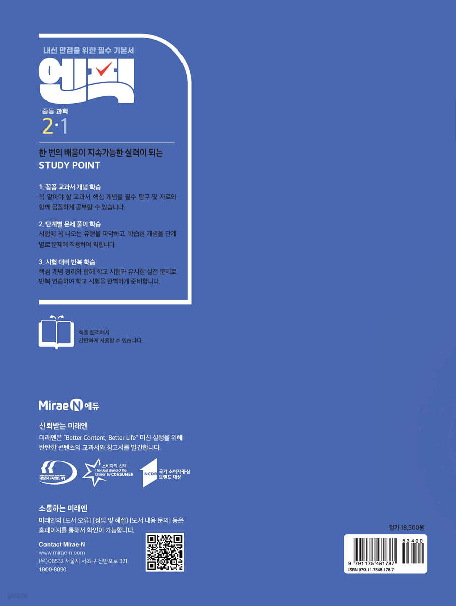 ■ 꼼꼼한 개념 정리와 확인 문제로 과학 핵심 개념 완전 정복 - 교과서의 핵심 개념을 다양한 시각 자료와 함께 공부하고, 공부한 내용을 바로 확인할 수 있습니다. - 시험에 꼭 나오는 탐구와 자료를 자세히 분석하여 제공하였고, QR 코드를 통해 탐구 영상도 확인할 수 있습니다. - 어려운 용어는 한자 풀이와 함께 제시하여 이해하기 쉽게 구성하였습니다. ■ 단계별 평가 문제를 차근차근 따라가면 학교 시험 준비 완료 - 유형 연습하기 코너를 통해 시험에 꼭 나오는 핵심 자료를 파악하고 문제 풀이로 집중 연습할 수 있습니다. - 실력 확인 문제, 서술형 문제를 통해 기출 문제를 접하면서 실력을 확인할 수 있습니다. - 대단원 마무리 문제로 객관식, 주관식, 서술형 문제까지 학교 시험을 완벽하게 준비할 수 있습니다. [ 시험대비편 ] ■ 시험 직전 최종 점검 - 강별 핵심 정리, 5 분 핵심 퀴즈를 통해 핵심 개념만 쏙쏙 뽑아 정리하고 핵심 퀴즈로 빠르게 점검할 수 있습니다. - 내신 대비 문제로 자주 출제되는 유형의 학교 시험을 대비하고 서술형 문제까지 연습할 수 있습니다. - 수행 평가 대비 문제로 탐구와 다양한 자료를 이용한 수행 평가까지 대비할 수 있습니다. [ 특별 부록 ] ■ 엔픽 알맹이 - 과학 알맹이만 쏙쏙 정리한 미니북으로 핵심 개념을 다시 한 번 확인할 수 있습니다. [ 바른답·알찬풀이 ] - 이해하기 쉽도록 자세하고 친절한 풀이를 제시하였습니다. - 오답 피하기, 자료 분석하기 등 엔픽만의 노하우를 수록하였습니다. |