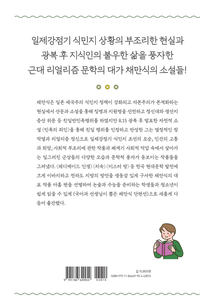 레디메이드 인생 - 11 논 이야기 - 51 치숙 - 80 미스터 방 - 104 쑥국새 - 122 왕치와 소새와 개미와 - 137 이상한 선생님 - 146 민족의 죄인 - 158 역로 - 220 연보 - 251 |