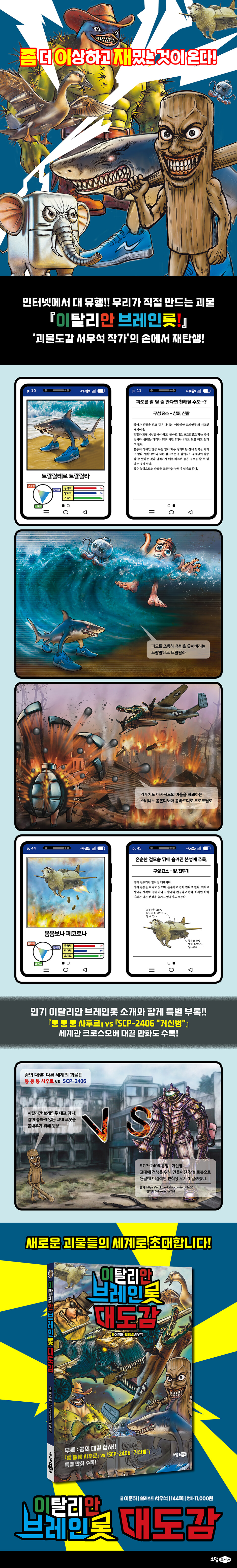 ▶ 인터넷의 화제였던 이탈리안 브레인롯에 대한 정보를 쉽게 파악할 수 있다. ▶ 괴물도감 서우석 작가의 고퀄리티 일러스트가 책에 가득하다. ▶ 모두가 만들어가는 괴물 이야기인 이탈리안 브레인롯을 보면서 상상력과 창의력을 기를 수 있다. |