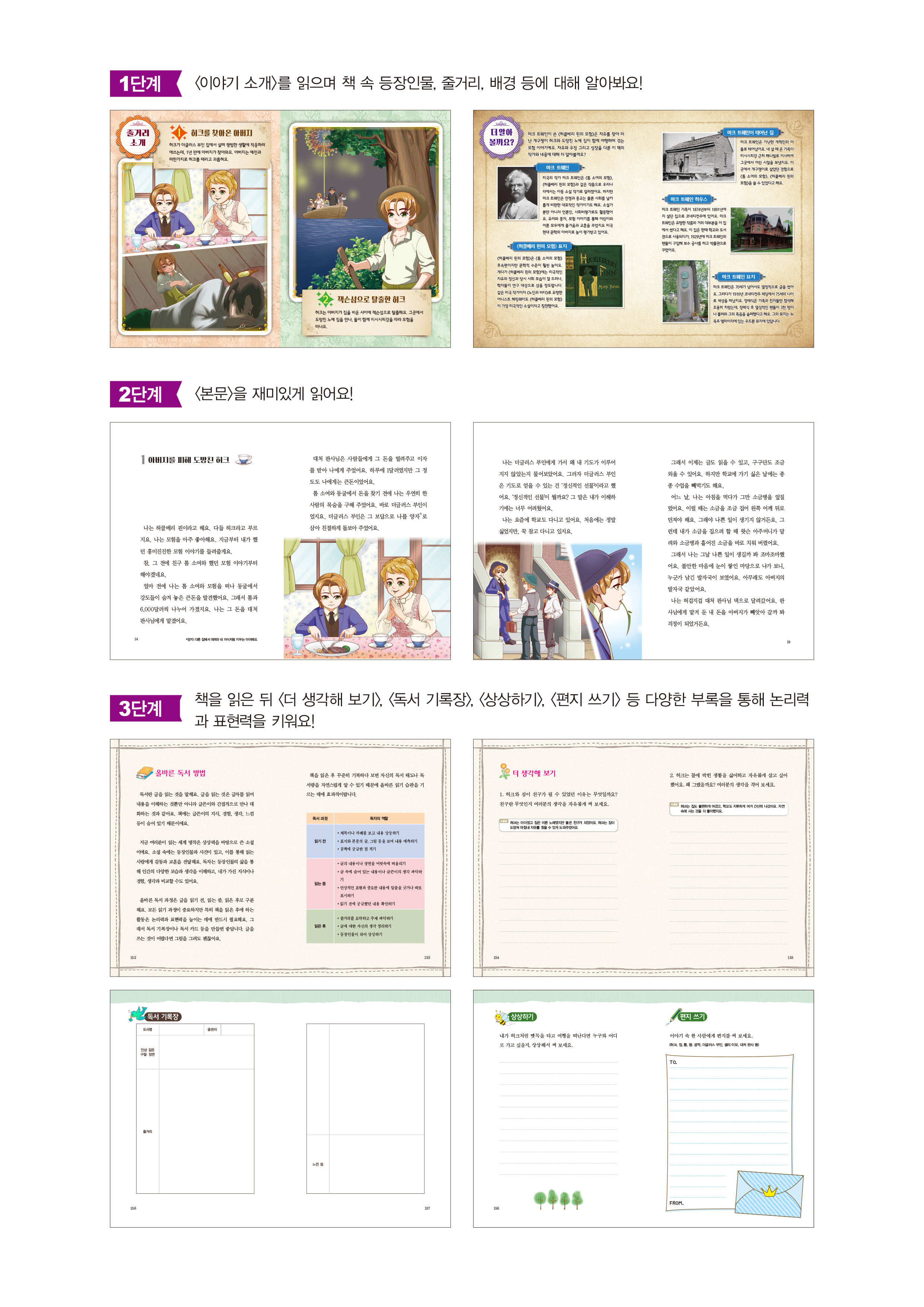 이 시리즈는 책을 읽기 전에 그림으로 된 〈이야기 소개〉 코너를 수록해 등장인물, 줄거리, 이야기의 배경 등에 대해 알려 주어 책에 대한 이해를 도와줍니다. 또 본문 뒤에 〈올바른 독서 방법〉을 수록해 책을 읽고 정리하는 방법을 알려 주고, 〈더 생각해 보기〉, 〈독서 기록장〉, 〈상상하기〉, 〈편지 쓰기〉 등의 다양한 활동을 통해 독후 활동을 재미있게 할 수 있도록 돕습니다. 아이들은 자기 생각을 정리하며 논리력과 표현력을 키울 수 있습니다. 〈책 읽기 3단계〉 * 1단계: 〈이야기 소개〉를 읽으며 책 속 등장인물, 줄거리, 배경 등에 대해 알아봐요! * 2단계: 〈본문〉을 재미있게 읽어요! * 3단계: 책을 읽은 뒤 〈더 생각해 보기〉, 〈독서 기록장〉, 〈상상하기〉, 〈편지 쓰기〉 등 다양한 부록을 통해 논리력과 표현력을 키워요! |