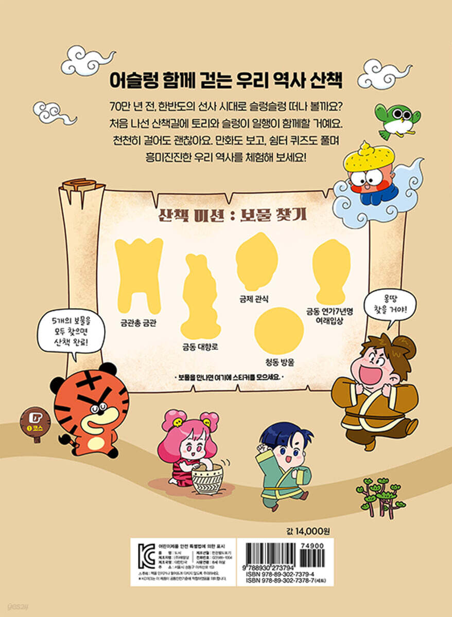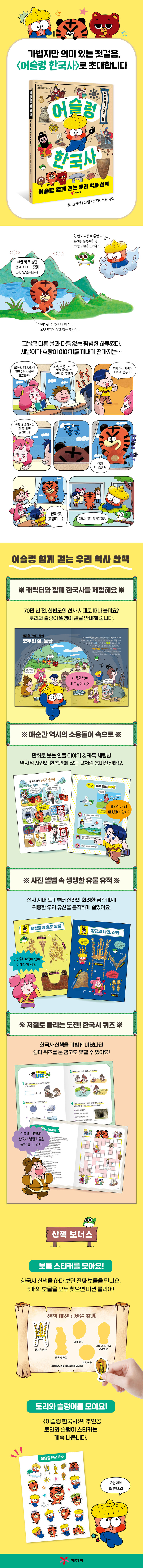 이 책에 살고 있는 슬렁이와 토리를 따라다니며 한국사를 체험해 보세요. 백두산 기슭에서 태어나 오천 년째 살고 있는 호랑이 슬렁이는 재미난 일이 없을까 궁리하던 중 구름을 타고 나타난 도깨비 토리를 만납니다. 토리는 슬렁이의 타임 리프를 도와주며 기나긴 한국사 산책을 이끌어 갑니다. 아기자기한 캐릭터들이 역사 속 현장을 누빌 때, 책을 읽는 독자들도 현장에 함께 있는 것처럼 몰입감을 느낍니다. 매순간 역사의 소용돌이 속으로 굵직한 역사의 소용돌이 속에서 왕을 비롯한 당시 사람들은 어떤 판단을 하고 어떤 선택을 했을까요? 또 만약 그 시대에 채팅 앱이 있었다면 사람들은 어떤 대화를 나누었을까요? ‘만화로 보는 인물 이야기’, ‘카톡 채팅방’ 코너는 어린이 독자들의 눈높이에 맞춰 옛날 사람들의 삶과 역사적 사건의 한복판에 있는 것처럼 흥미진진합니다. 책 전체에는 중요 인물과 사건, 지명 등을 다양한 서체로 강조해 두어 기억하기 쉽고, 다른 사건에서 등장할 때 연결 고리를 빠르게 파악할 수 있습니다. 사진 앨범 속 생생한 유물 유적 [어슬렁 한국사] 1권에서는 선사 시대 여러 토기에서부터 고구려 희귀 불상, 백제 무령왕릉 출토 유물, 신라의 금관 등 다채로운 유물 유적 사진을 큼직하게 실었습니다. 발견된 수많은 유산들은 역사책보다 더 많은 이야기를 해 줍니다. 오래 전에 이 땅에 살았던 사람들의 도구였거나 기록이었던 귀중한 유산들도 놓치지 말고 배워 가세요. 저절로 풀리는 도전! 한국사 퀴즈 각 꼭지가 끝날 때마다 ‘쉼터 퀴즈’를 두어 배우고 익힌 내용을 정리해 보는 시간을 갖도록 했습니다. 눈치가 빠르거나 눈썰미가 좋은 독자라면 한국사 산책 중에 눈여겨보았던 것들이 퀴즈로 나오기 때문에 눈 감고도 맞힐 수 있답니다. 1권 산책을 마쳤다면 ‘한국사 낱말퍼즐’에 도전해 보세요. 뒷표지에 있는 산책 미션 보물 찾기까지 해냈다면 우리 역사를 제법 아는 어린이가 되어 있을 거예요! |